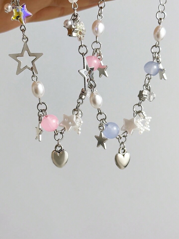 Kawaii مجموعة من سوارين أنيقين ولطيفين على شكل نجمة مع قلادة لؤلؤ وكريستال للنساء، مناسبين لفصل الصيف والارتداء اليومي، هدية للأصدقاء أو الأزواج