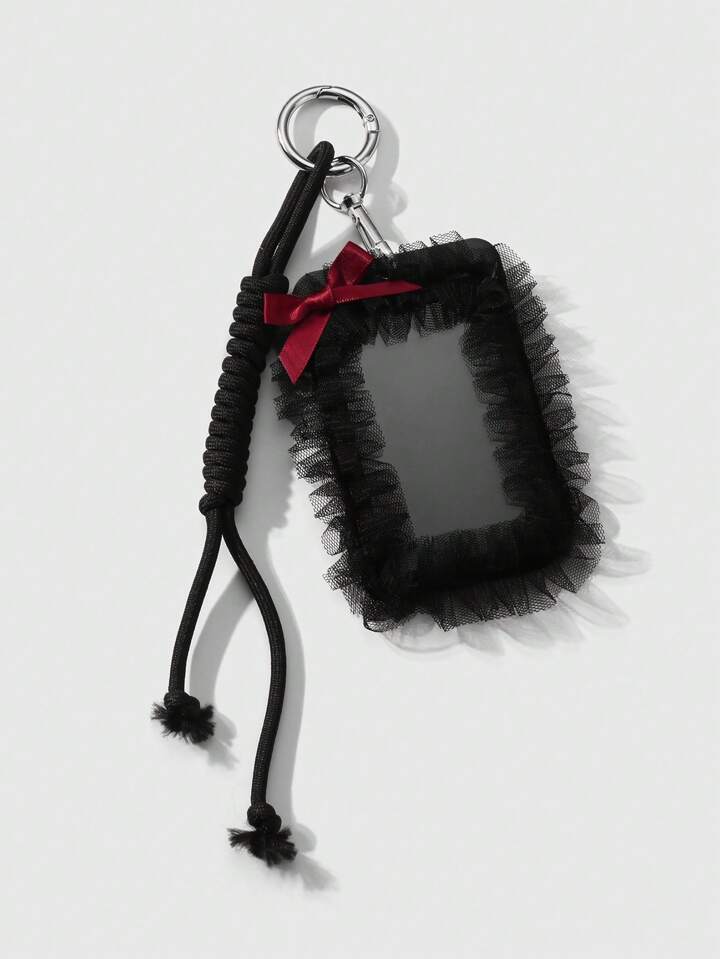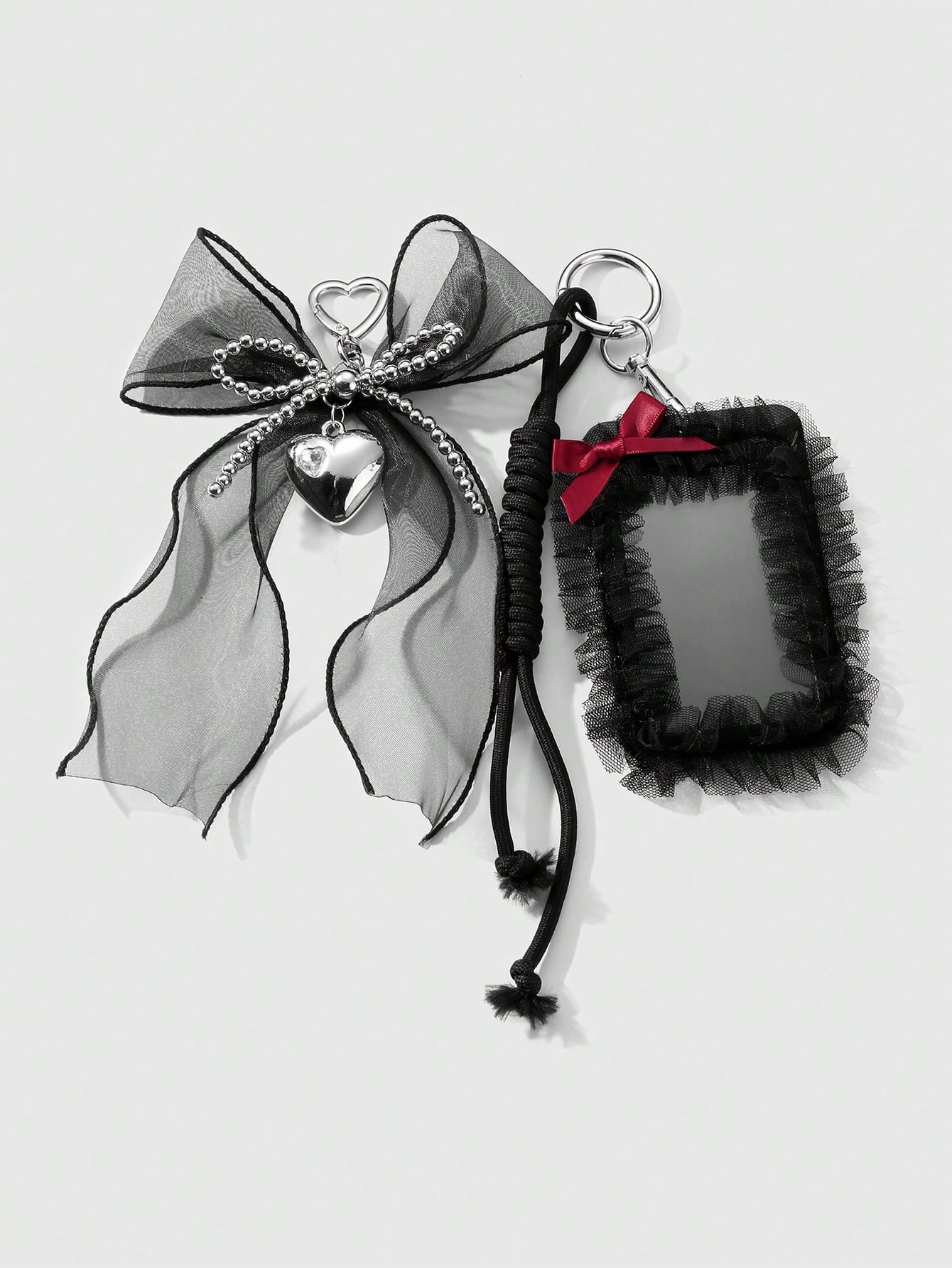 Kawaii مجموعة مكونة من 2 قطعة، شريط شبكي أسود وشبكة معدنية فضية بشكل فيونكة فاخرة مزينة بخرز وإكسسوارات قلب راين ستون. حامل بطاقة هوية بشريط متعدد الاستخدام، مناسبة للأزواج والأخوات وأفضل الأصدقاء للاستخدام اليومي والهدايا المناسبة للمناسبات
