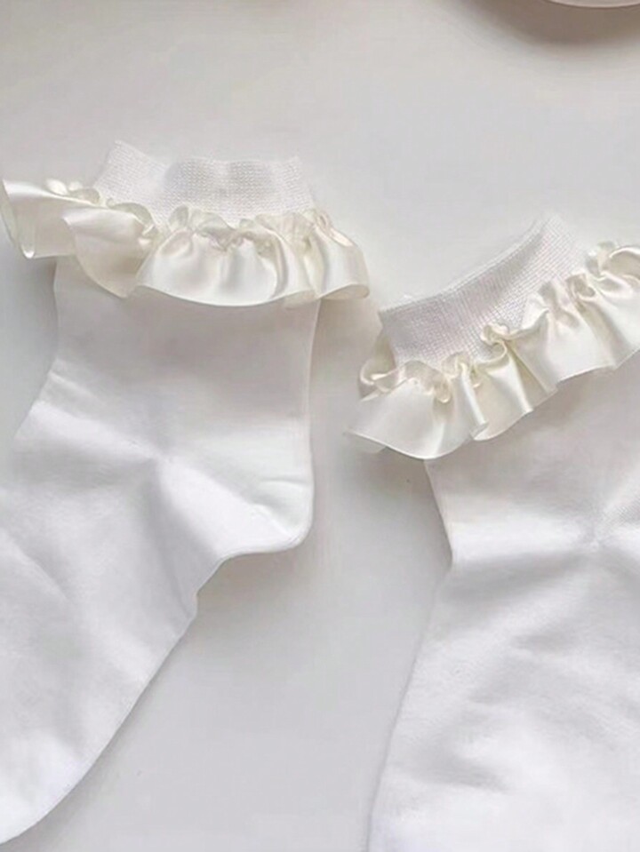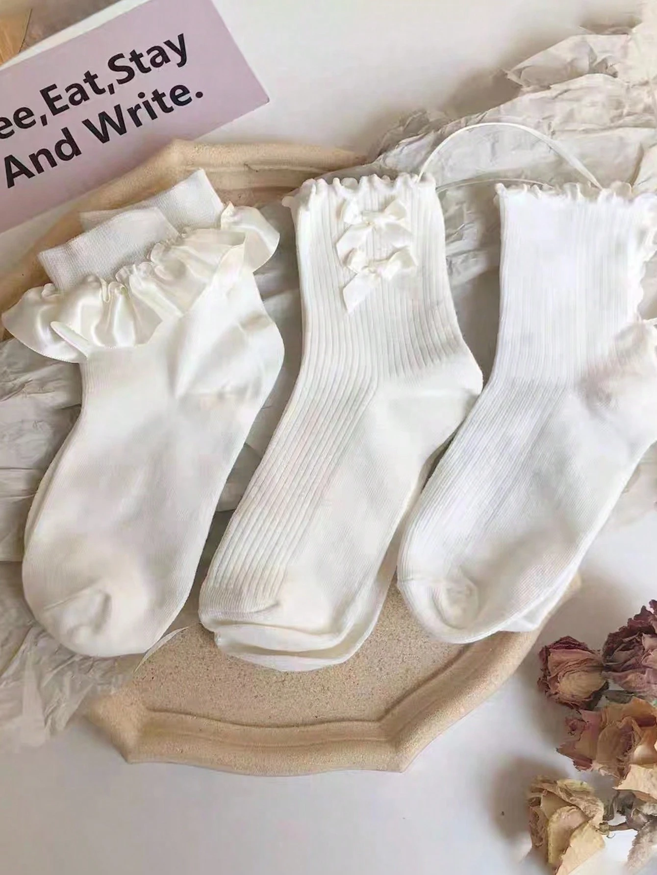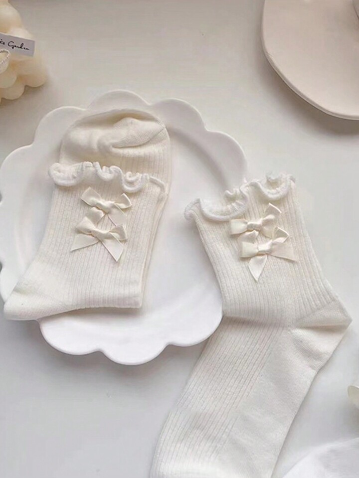 Kawaii جوارب طاقم موحدة اللون مزخرف بعقدة الفراشة مقلم نمط نبات الخس 3 ازواج نساء