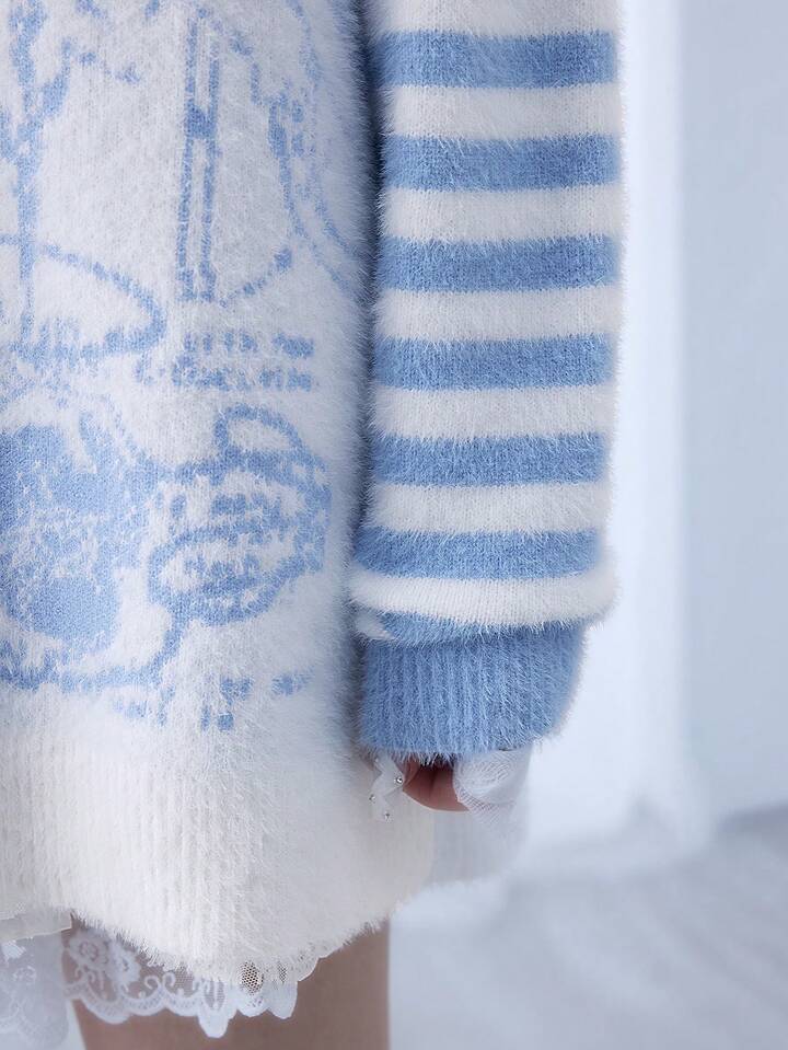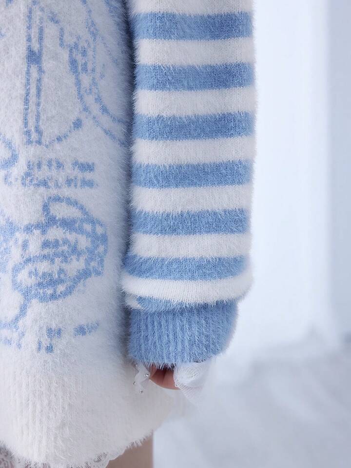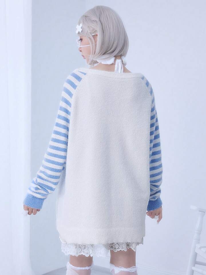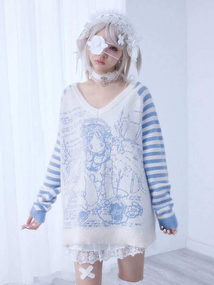 Kawaii كنزة صوفية كنزة فضفاضة بياقة على شكل حرف V مخططة ذات أجنحة بطابع كاواييي أنمي، بطراز ياباني جميل