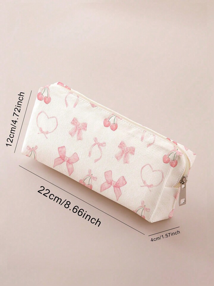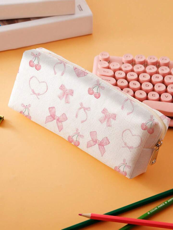 Kawaii علبة أقلام مطبوع عليها نمط الشريط والكرز مطبوعة على الجانبين مزينة بعقدة الشريط للاستخدام المدرسي