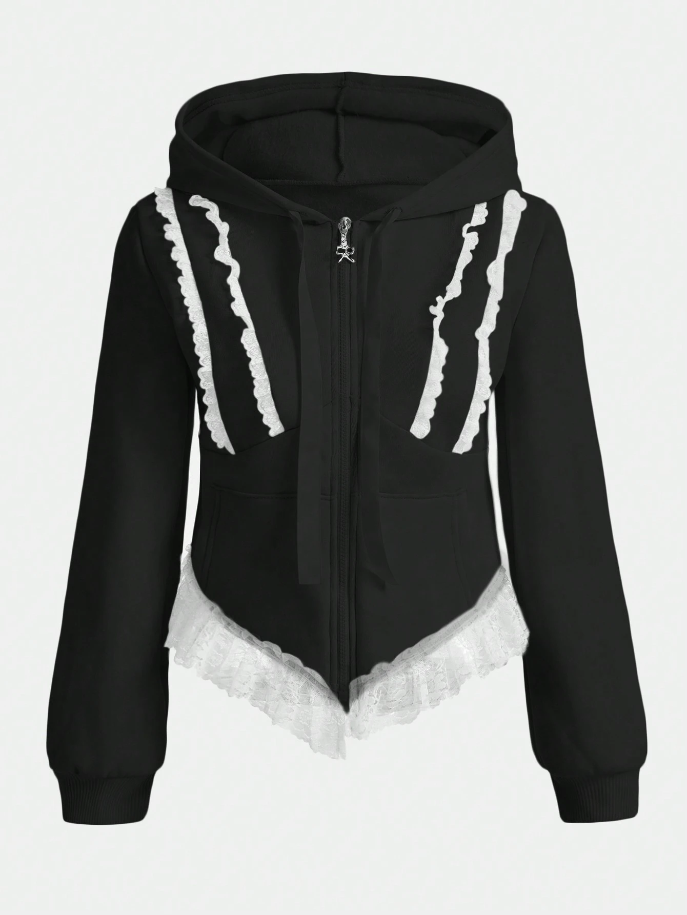 Kawaii هودي مع خياطة حجرات متباينة اللون وسحاب ورباط