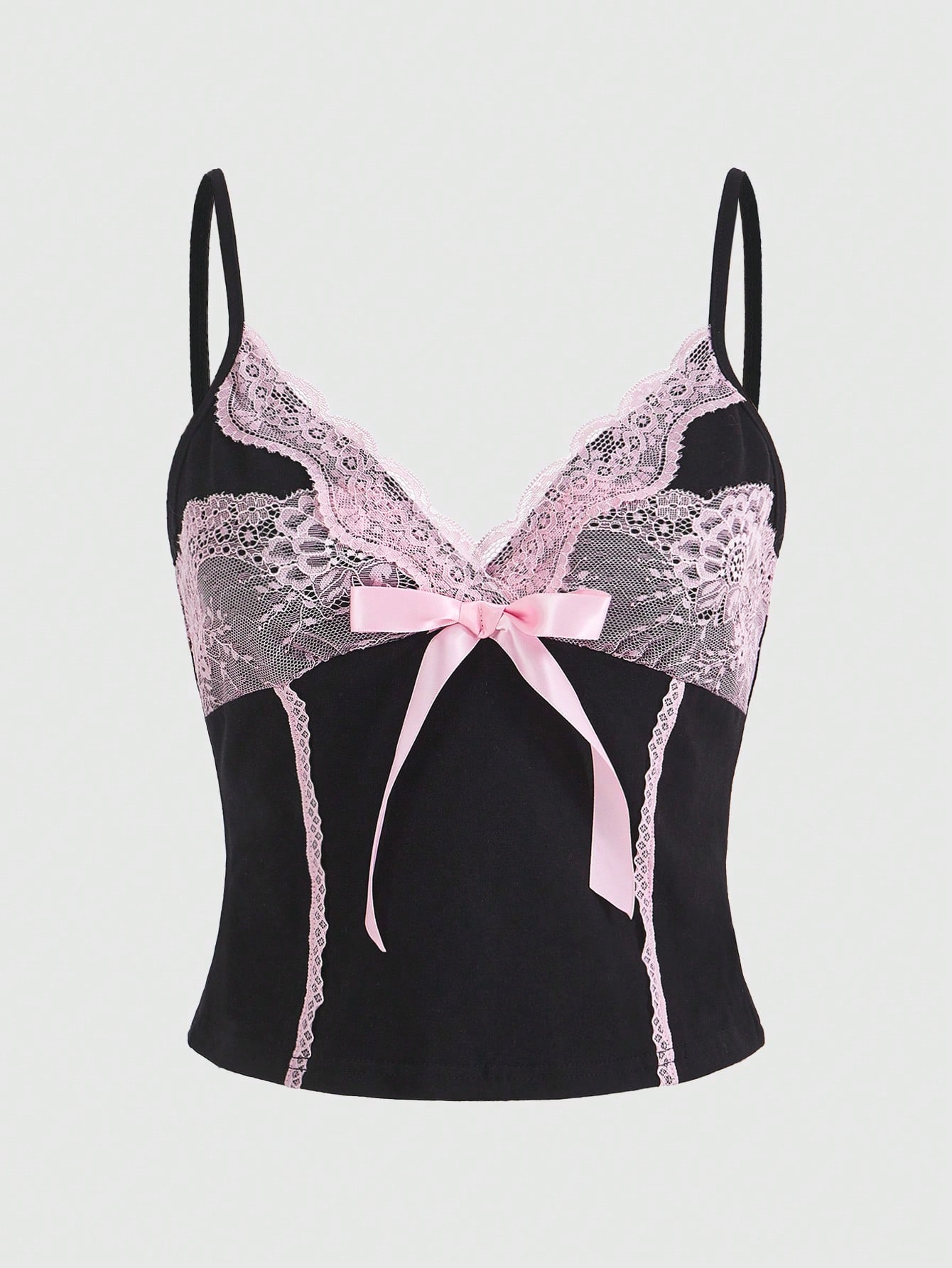 Kawaii صدرية كامي دانتيل متباين اللون عقدة الفراشة أمامية