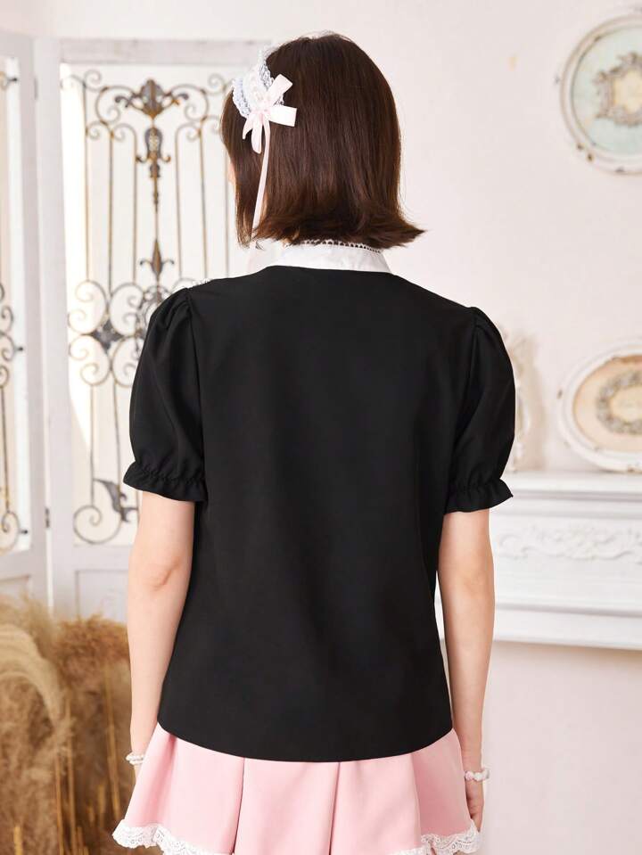 Kawaii بلوزة دانتيل متباين اللون مقلم بكشكش اكمام منتفخة