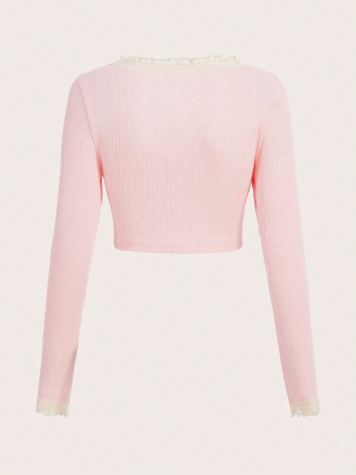 Kawaii تي شيرت دانتيل متباين اللون ربطة امامية