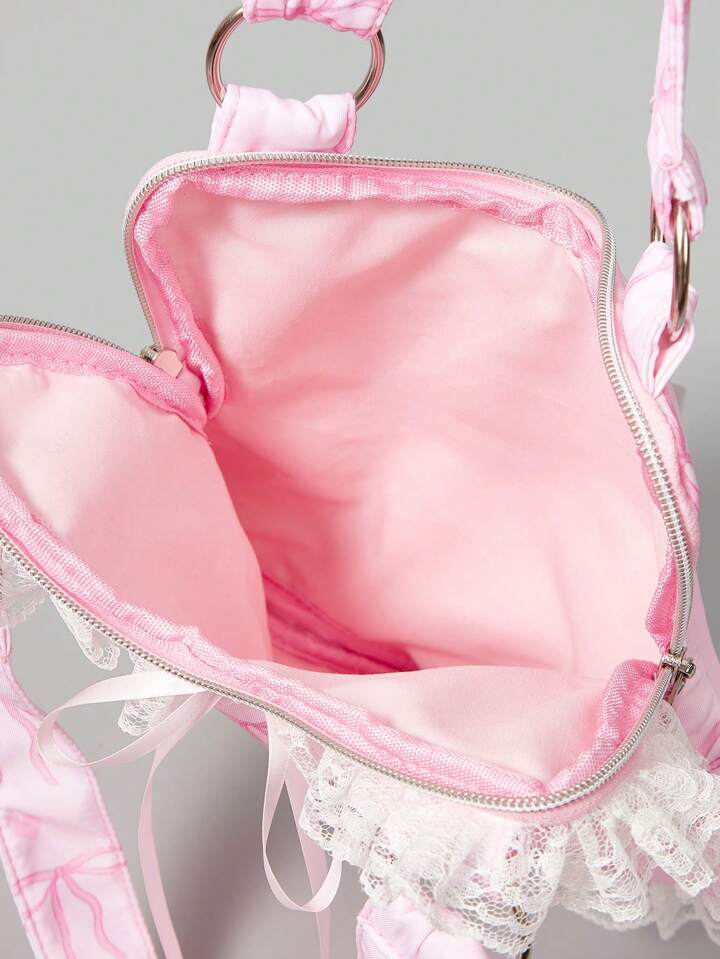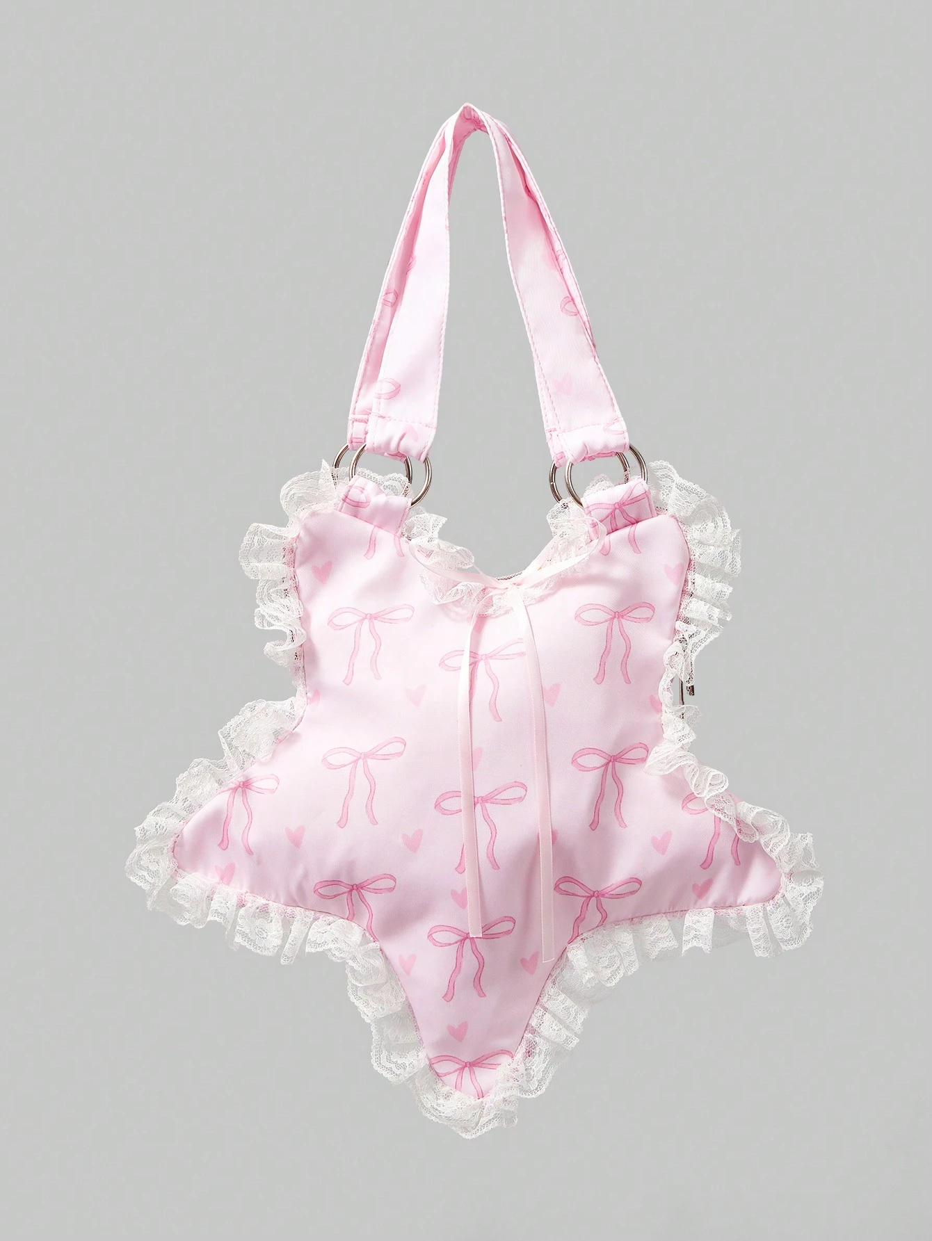 Kawaii حقيبة كتف نسائية بنقشة نجوم وفيونكة لونها زهري جذاب للاستخدام الجامعي