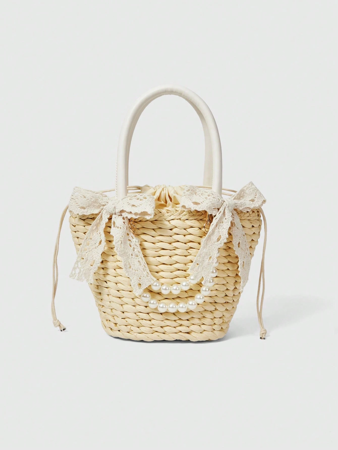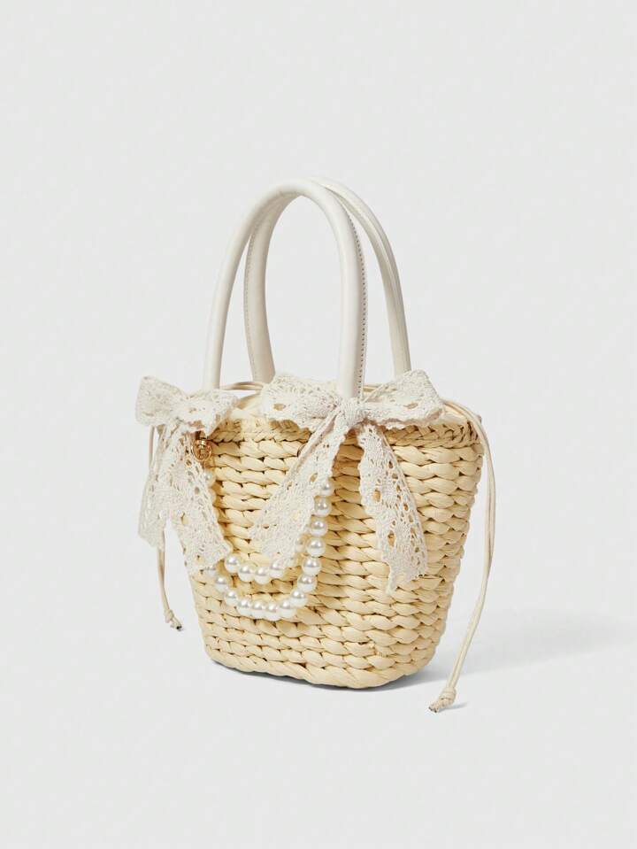 Kawaii حقيبة يد نسائية من القش مزخرفة بالدانتيل واللؤلؤ والعقدة الجميلة