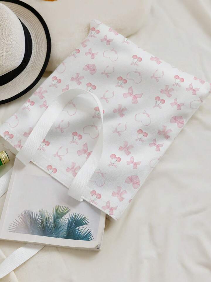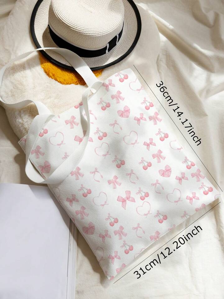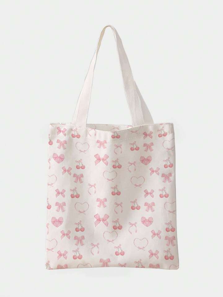Kawaii حقيبة كتف قماشية مطبوعة ذات وجهين بطبعة قلوب الزهور الوردية والكرز الجميلة