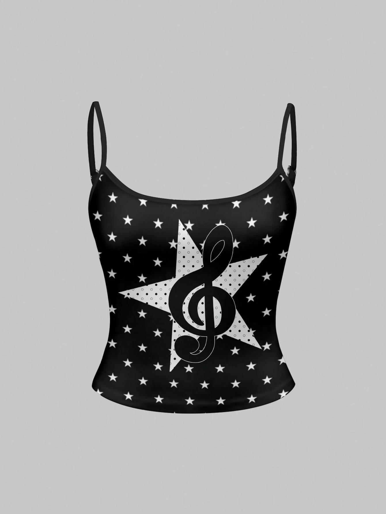 Kawaii قميص كامل الطباعة بنقاط وأنجم وملاحظات موسيقية بيضاء وسوداء، طراز فتاة كيوت عتيق