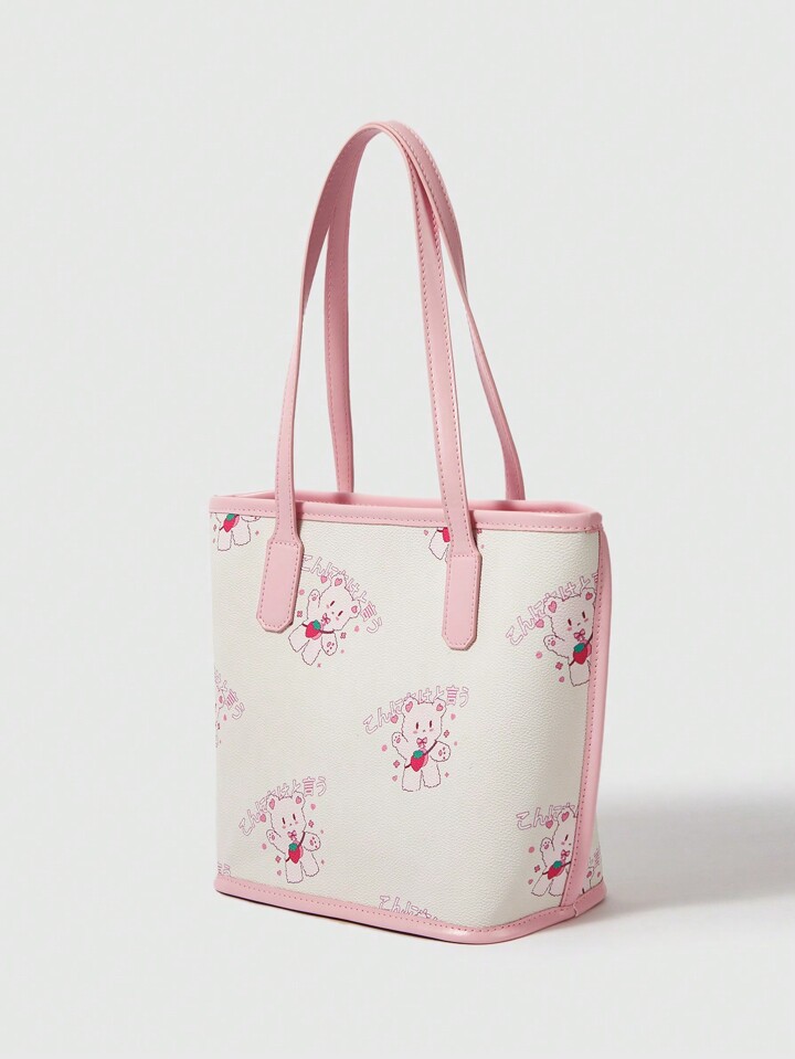 Kawaii حقيبة تسوق حوامل بطبعة الدب الفراولة وألوان الكتل مع حزام للكتف