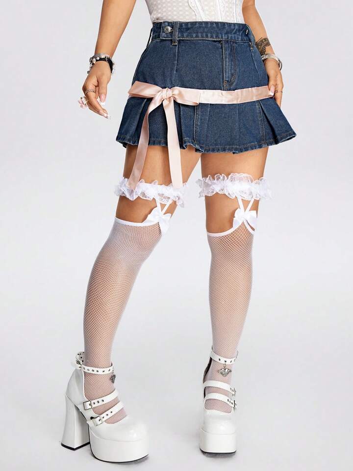 Kawaii تنورة جينز مع ربطة فراشة وزخرفة وتصميم منقوش ، للمدرسة
