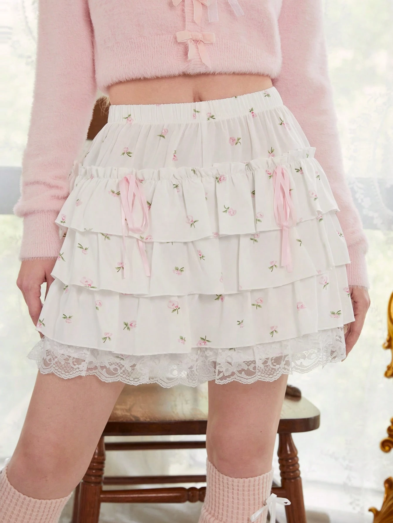 Kawaii تنورة بطباعة أزهار اقحوان دانتيل متباين اللون بحافة طبقات