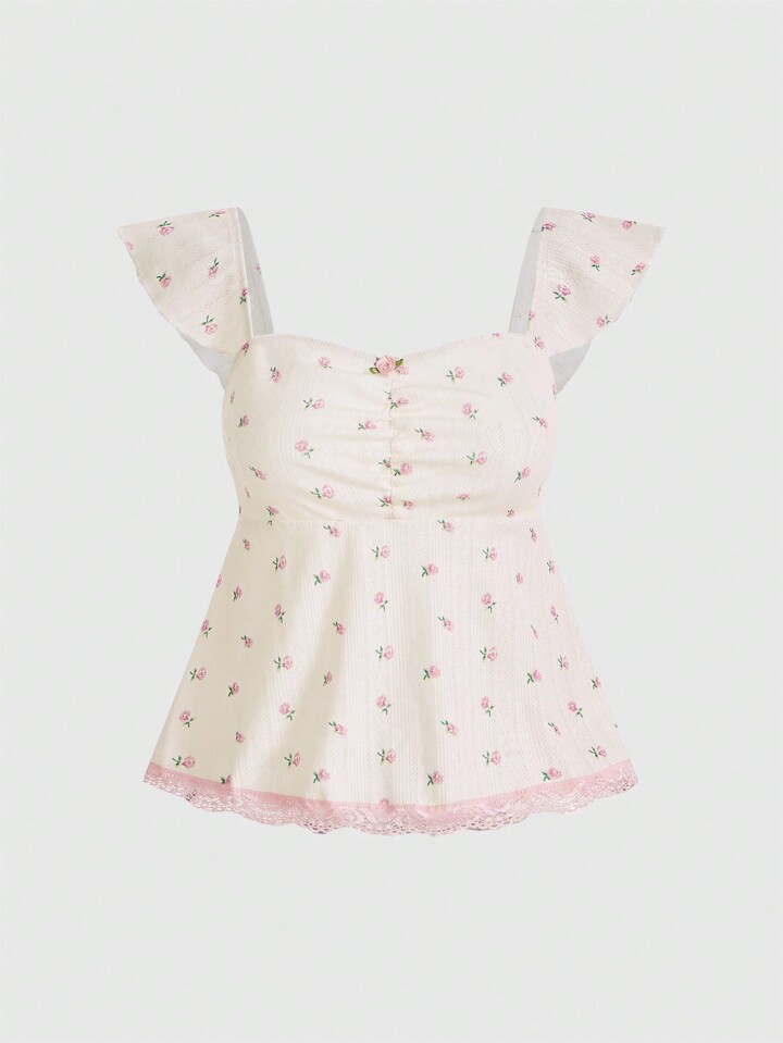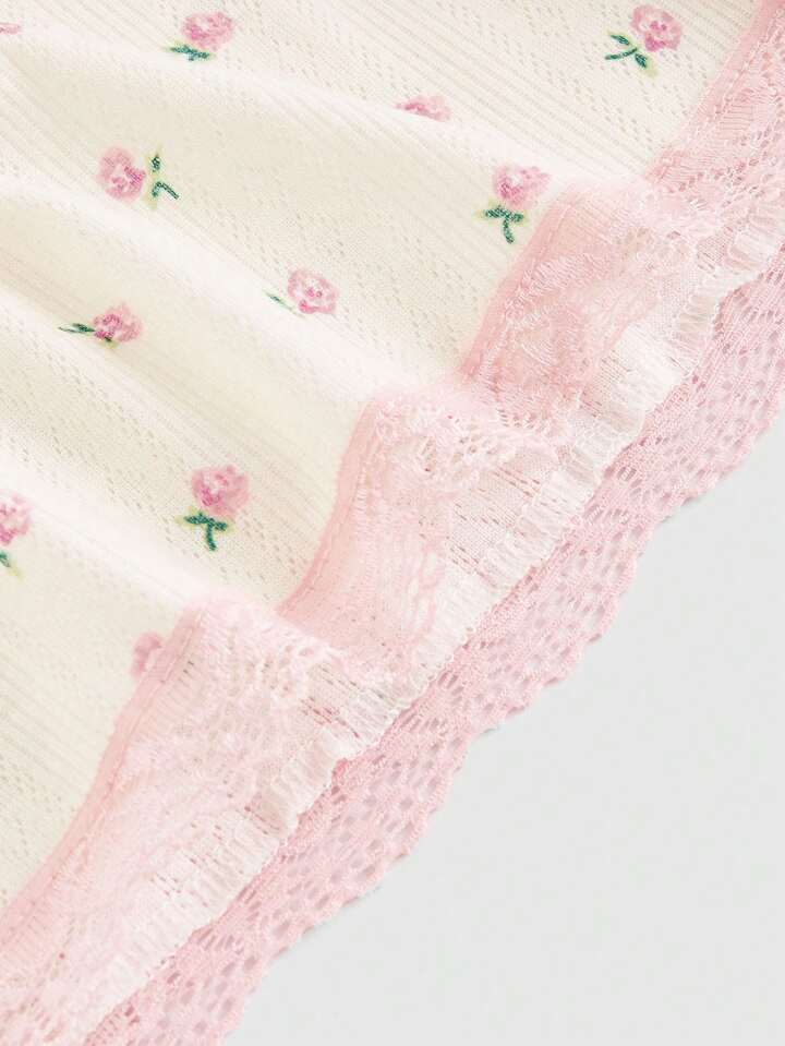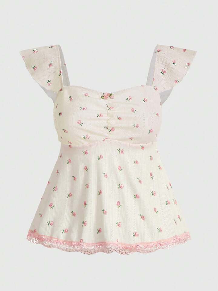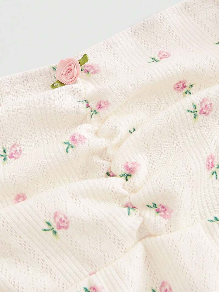 Kawaii توب بيبي دول بطبعة زهور نثرية روش في الصدر بشريط دانتيل، مناسب للمدرسة