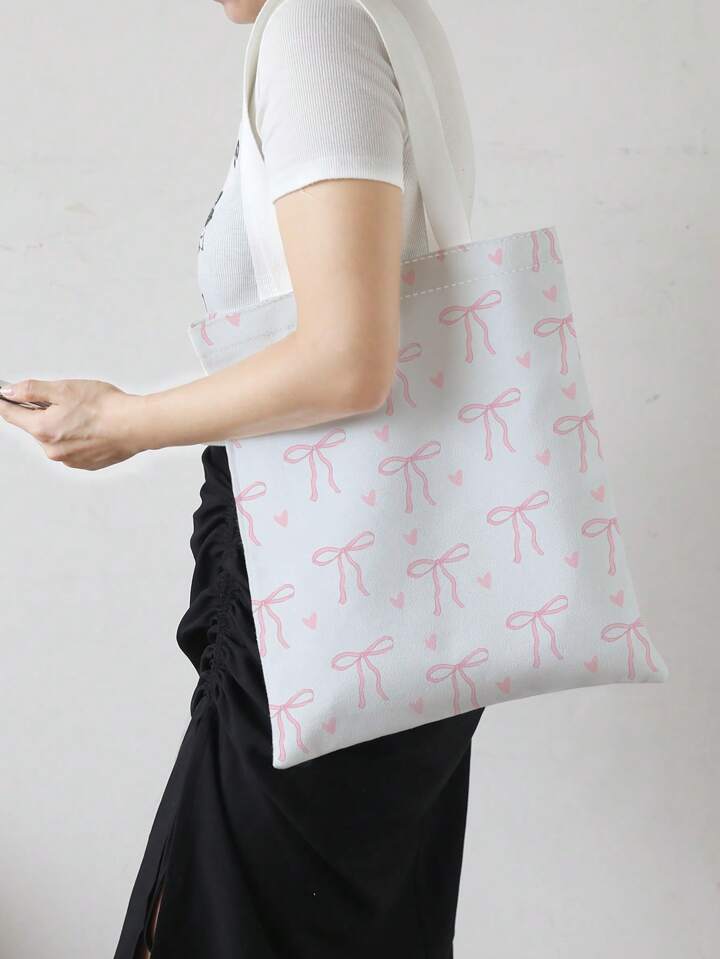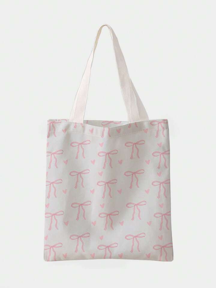 Kawaii حقيبة كانفاس ذو وجهين مطبوع عليهما قلب و فيونكة