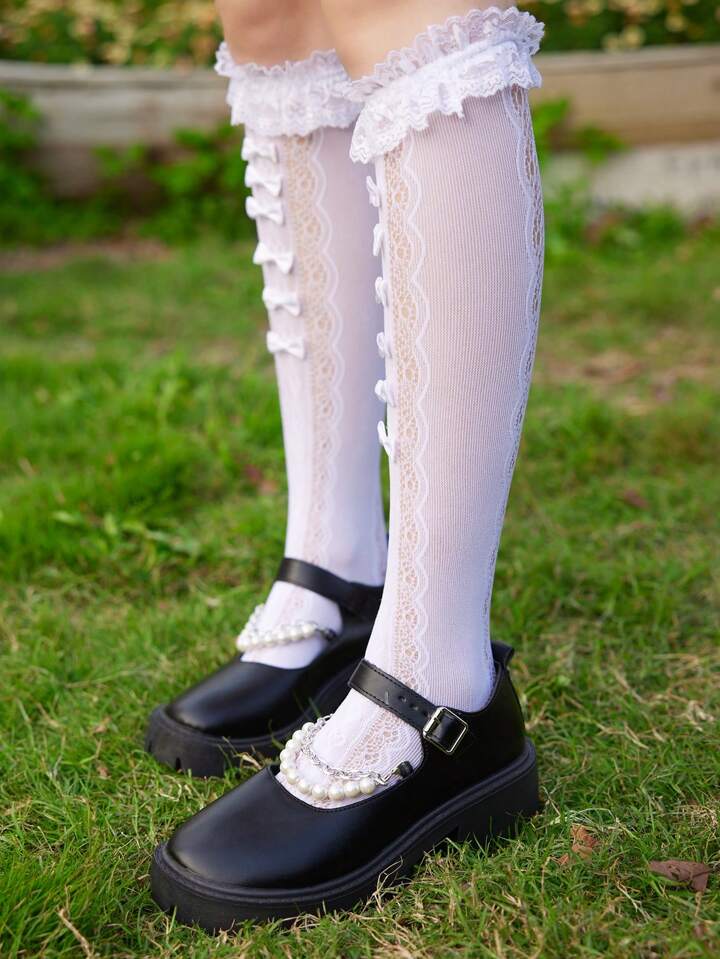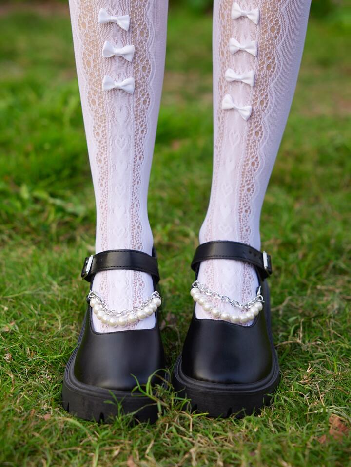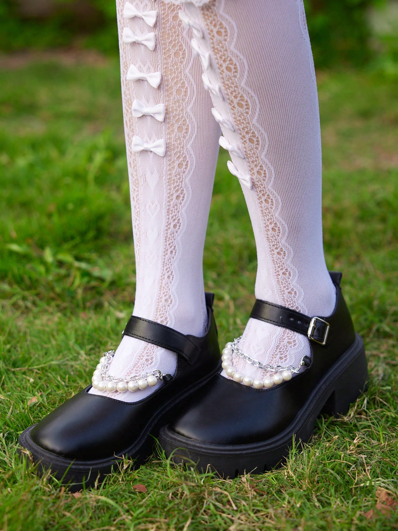 Kawaii موضة أسود أحذية ماري جين الى لؤلؤ صناعي و ديكور سلسلة منصة حذاء كعب مكتنز