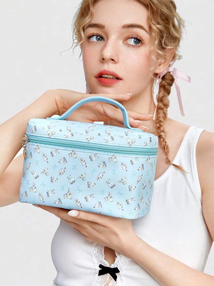 Kawaii حقيبة تجميل محمولة سعة كبيرة قابلة للطي بغطاء كات بلو أنيق ولطيف 330365