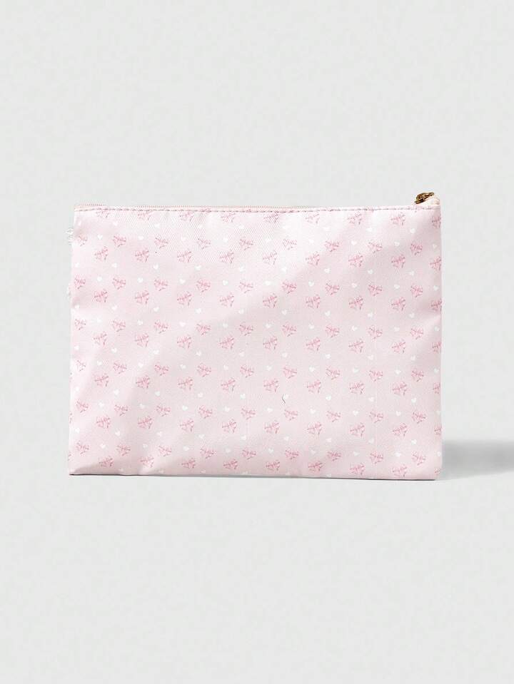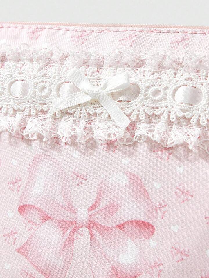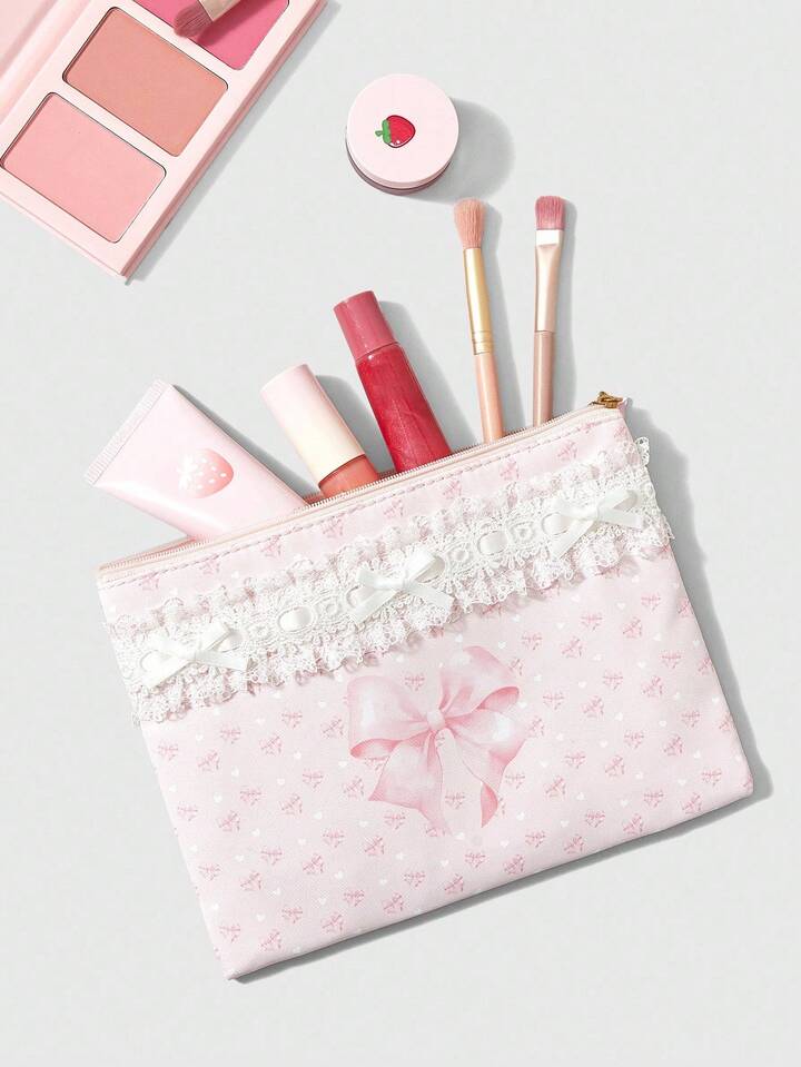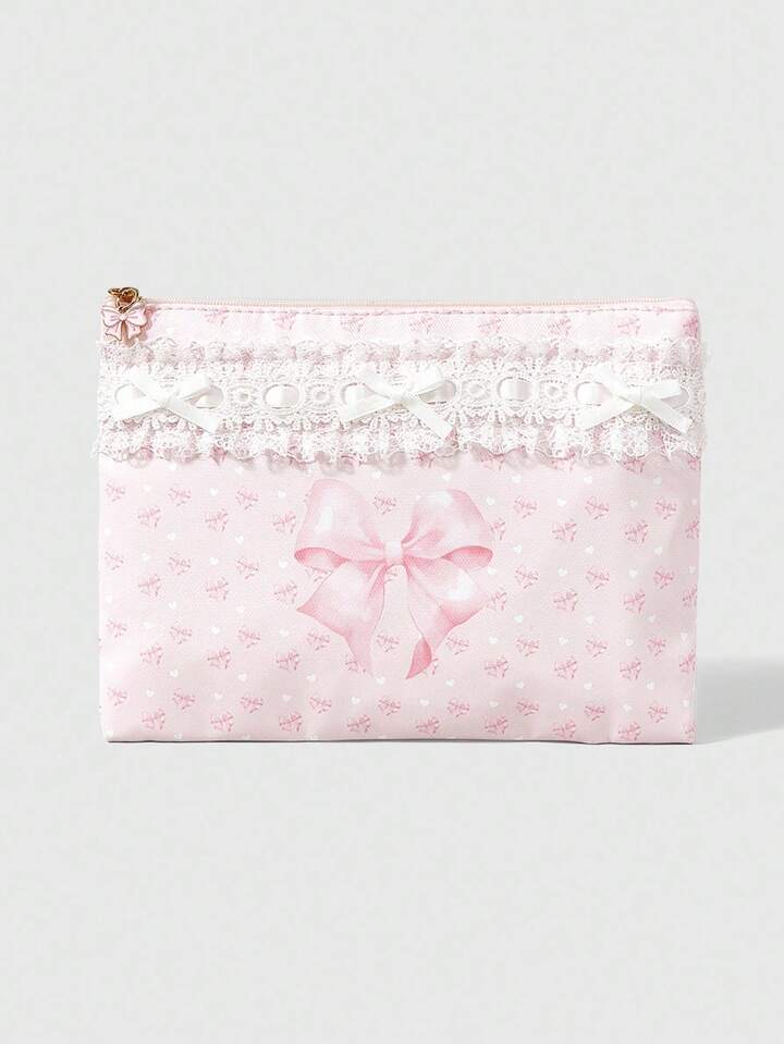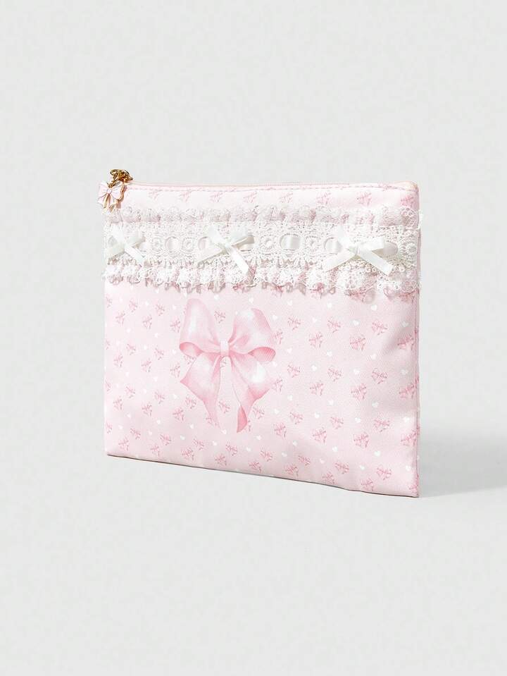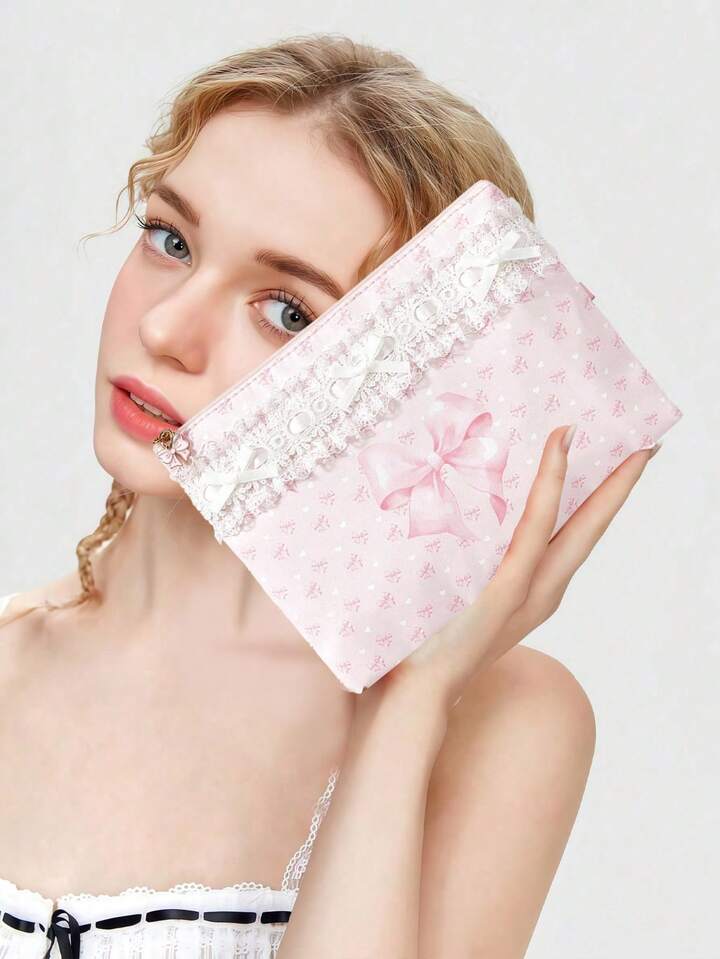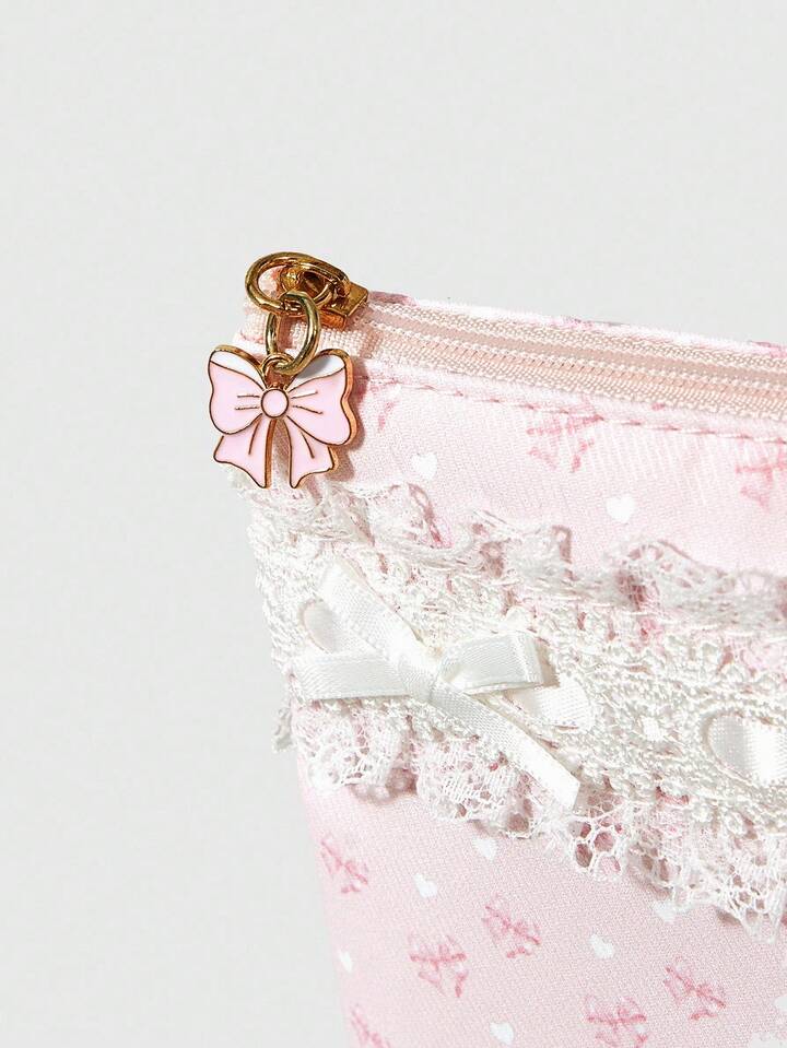 Kawaii حقيبة مكياج ذات وظيفة تخزين مع نمط الفيونكة الدانتيل المنتشر بالكامل 401422