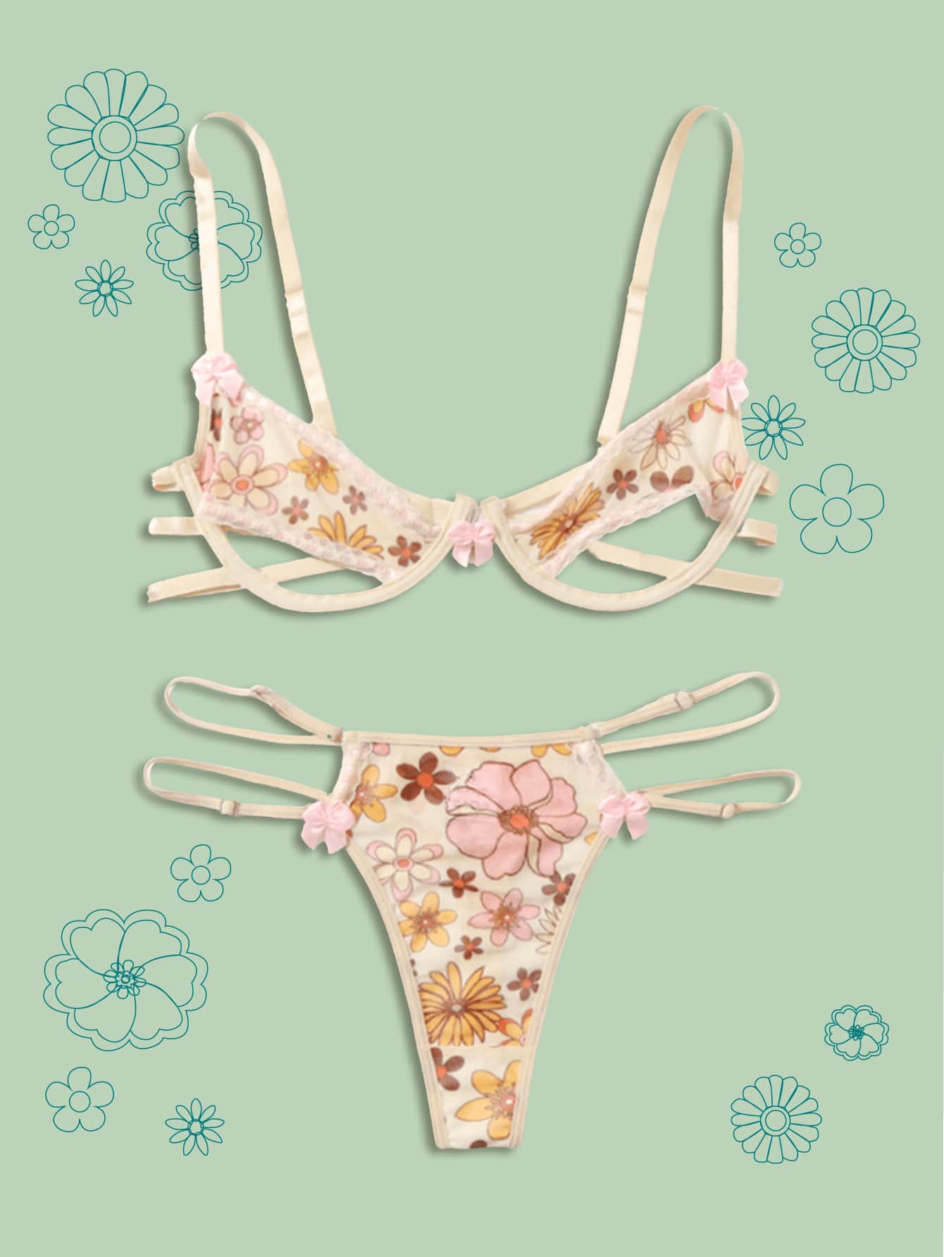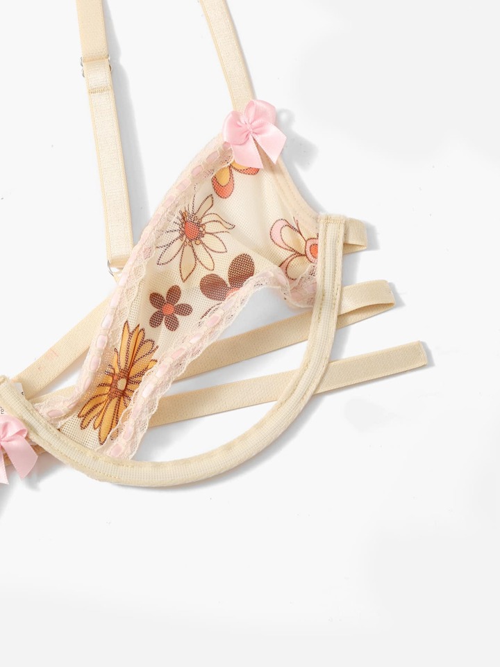 Kawaii طقم ملابس داخلية طباعة الأزهار قص مجوف مزخرف بقوس