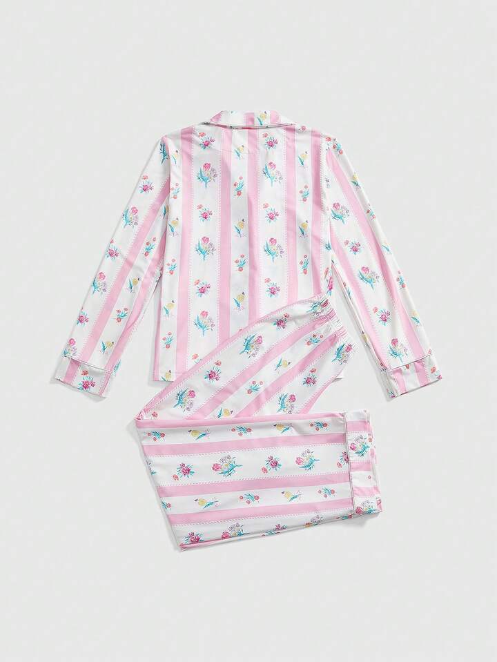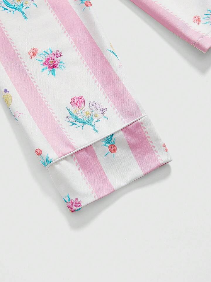 Kawaii مجموعة بيجاما نسائية كاجوال بأكمام طويلة مكونة من ملابس علوية ذات طوق طباعة الأزهار والشريط والبنطلون