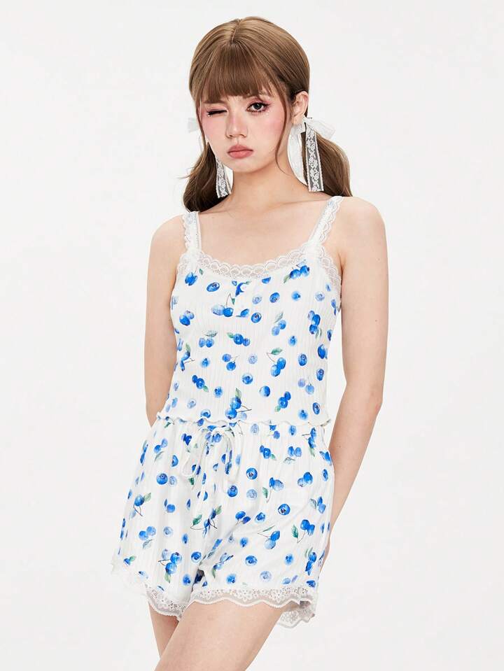Kawaii مجموعة ملابس نوم للسيدات مكوّنة من كاميسول بالألوان الزرقاء والأرجواني المصنوعة من الصوف المضلّع ومزيّنة بالعنب الأزرق الطازج