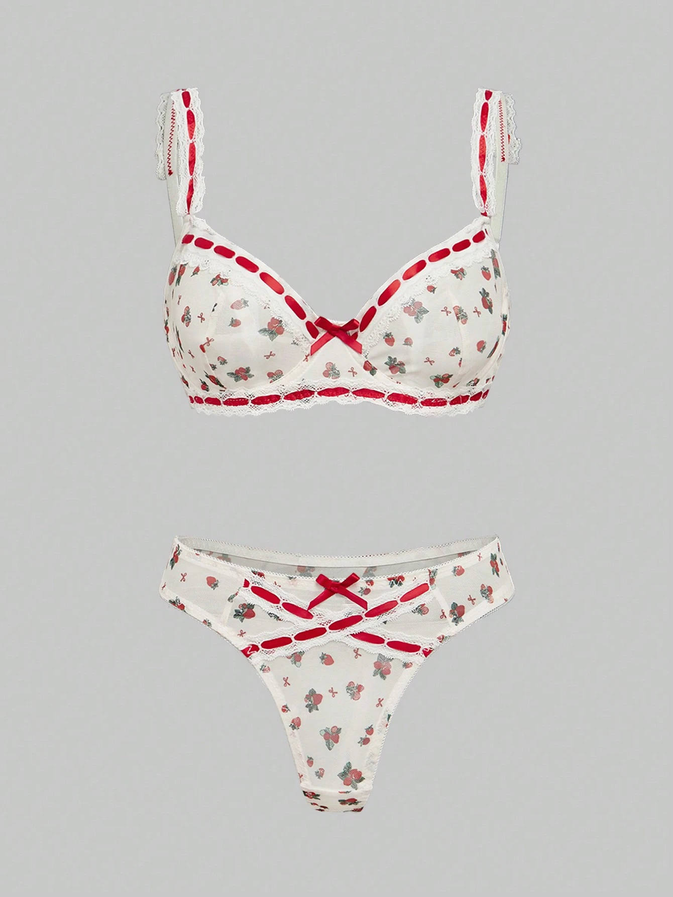 Kawaii مجموعة حمالات صدر مبطنة مطبوعة مع أشرطة دانتيل ذات ألوان الفراولة والزهور في طراز ريفي طازج