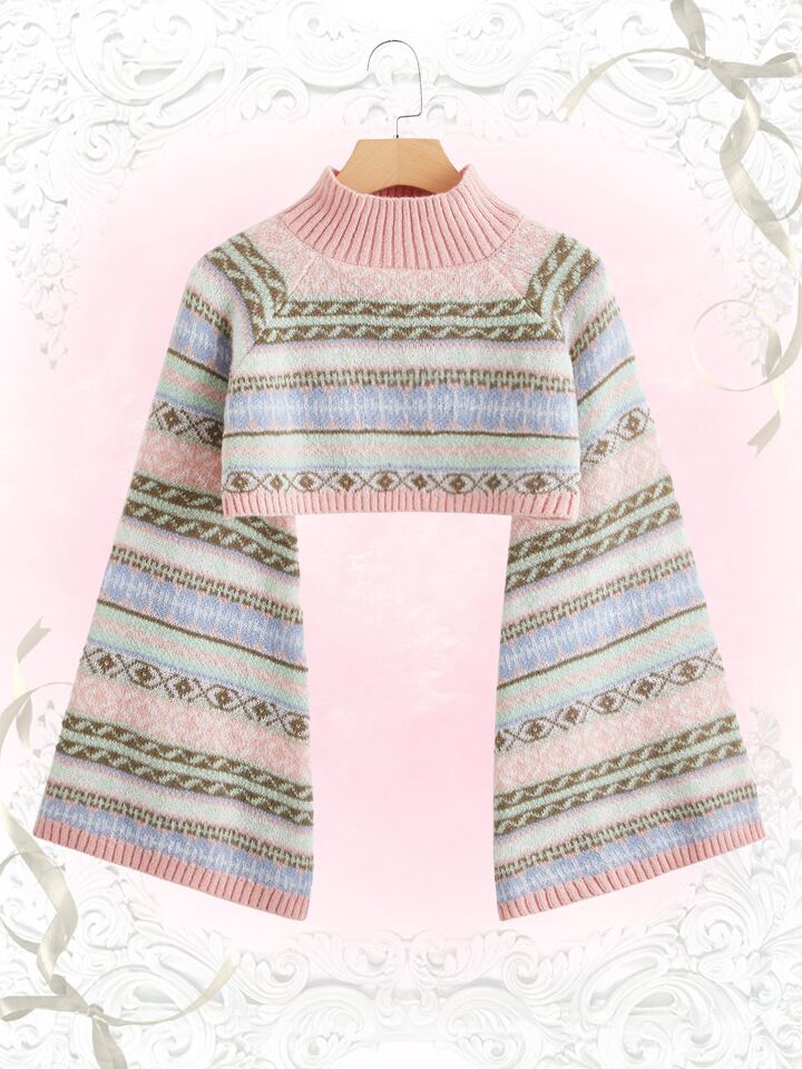 Kawaii كنزة صوف قصير نمط هندسي أكمام جرس