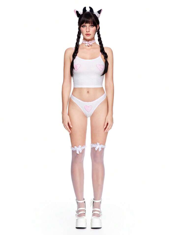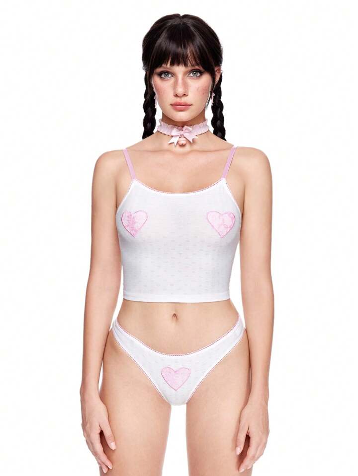 Kawaii طقم ملابس داخلية مكون من سلاسل وملابس رومانسية لعيد الحب مزين بالتطريز والدانتيل بشكل قلب بنظام بدون أسلاك