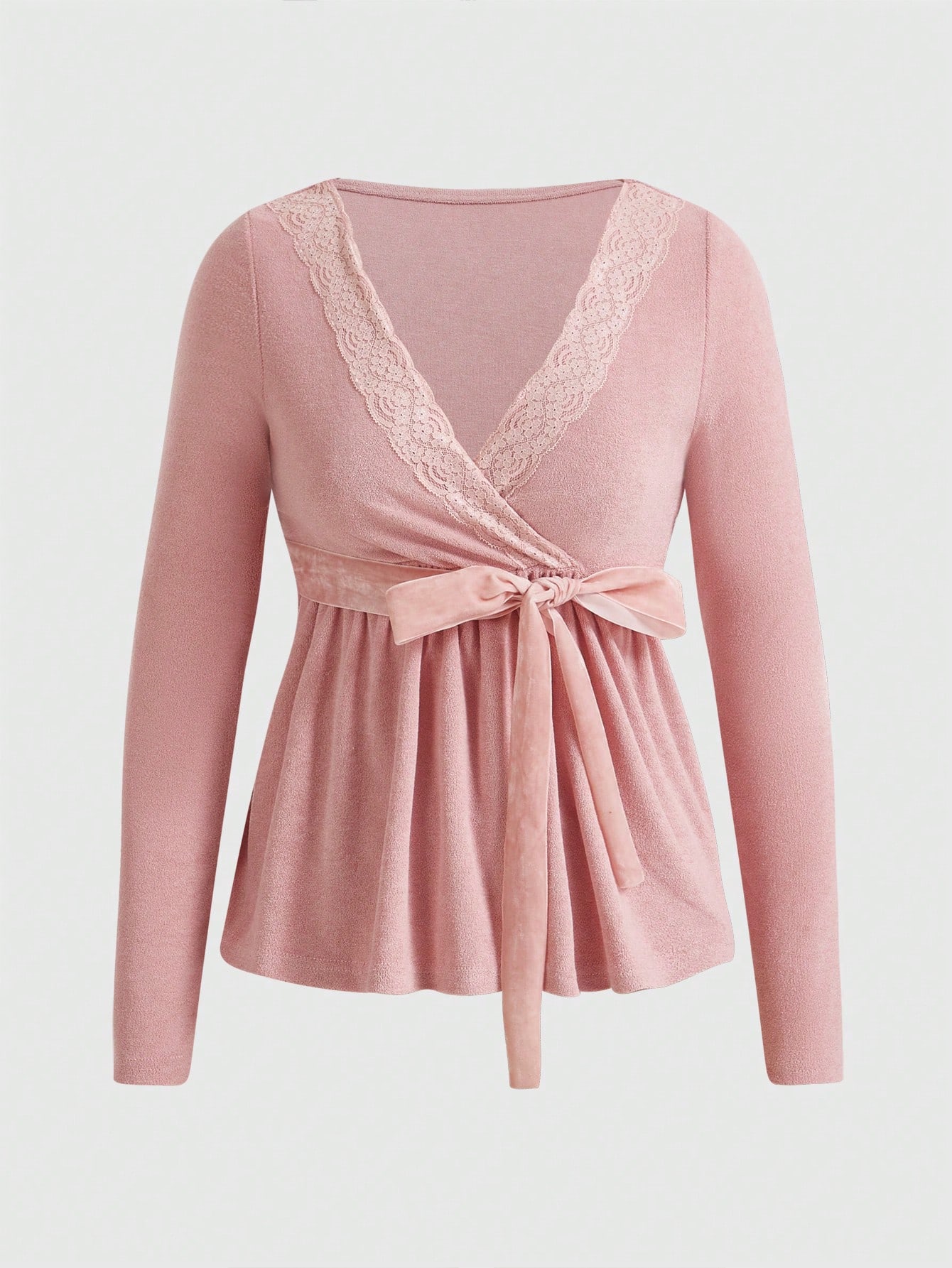 Kawaii تي شيرت مقلم دانتيل حزام زخارف