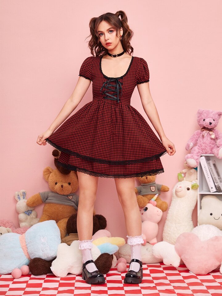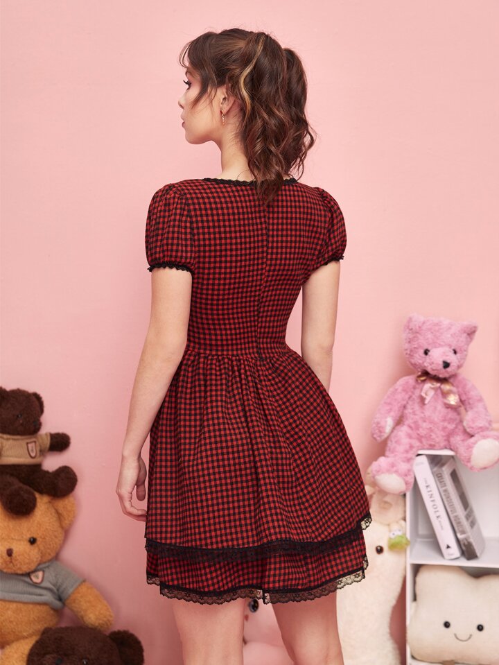 Kawaii فستان رباط بطباعة مربعات غنغهام دانتيل متباين اللون طبقات