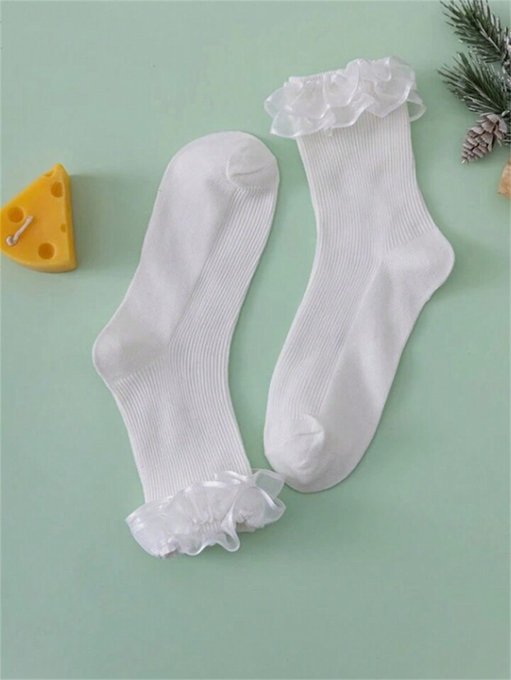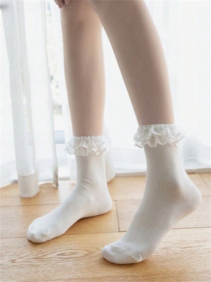 Kawaii جوارب منتصف الساق للسيدات ذات حواف من الدانتيل الأبيض