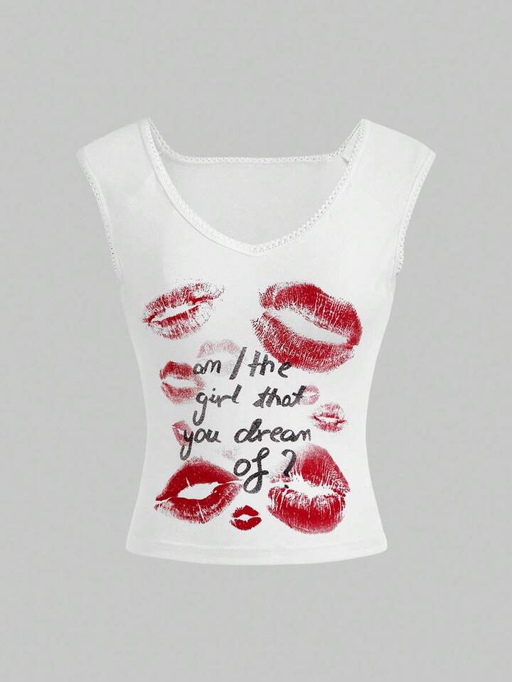 Kawaii تي شيرت بطباعة شعار وشفاه