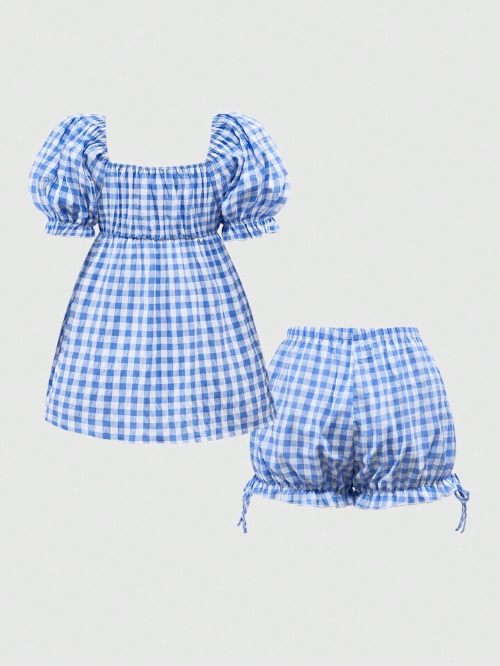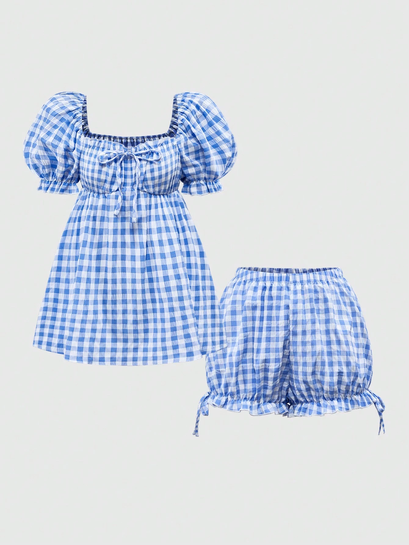 Kawaii طقم بيجامة مع رقبة دمية ذات أكمام منتفخة وطراز شريطي ريفي طبيعي