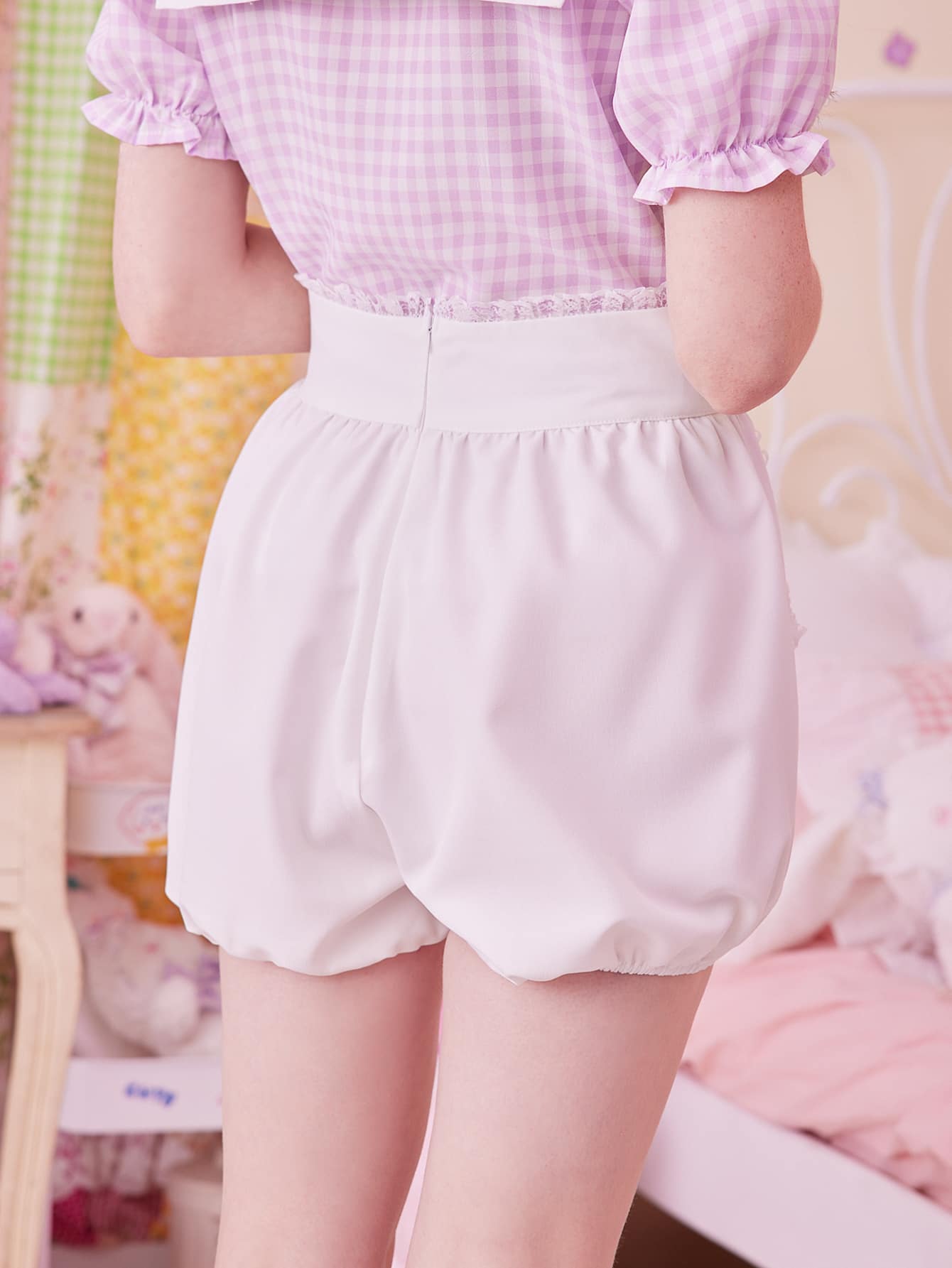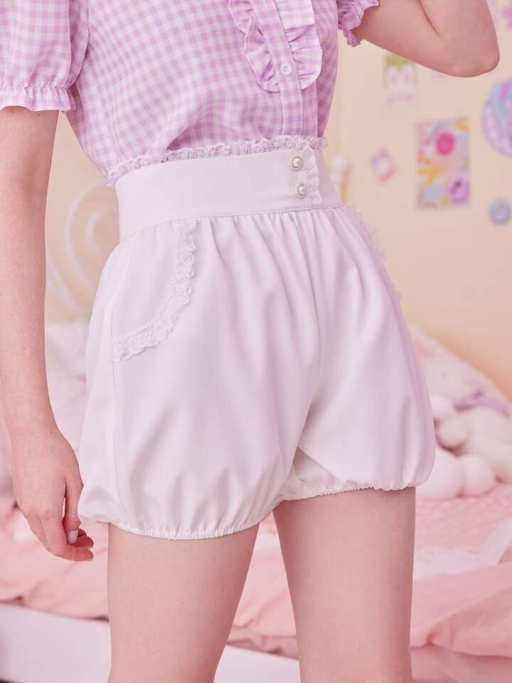 Kawaii بنطلون قصير مزخرف باللؤلؤ دانتيل متباين اللون