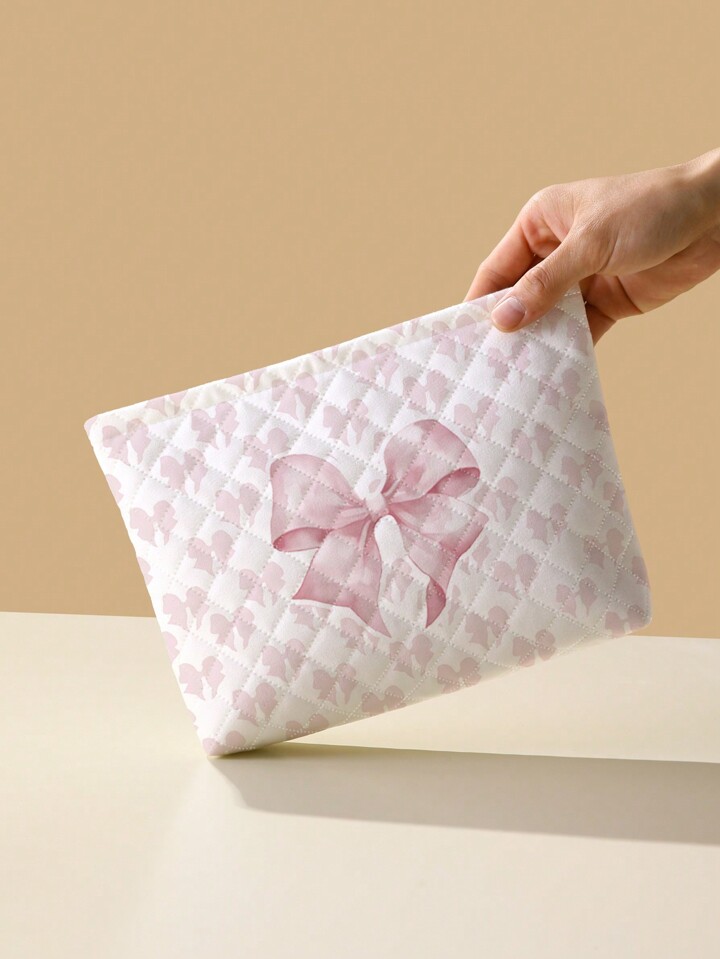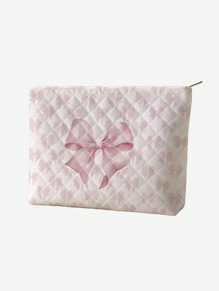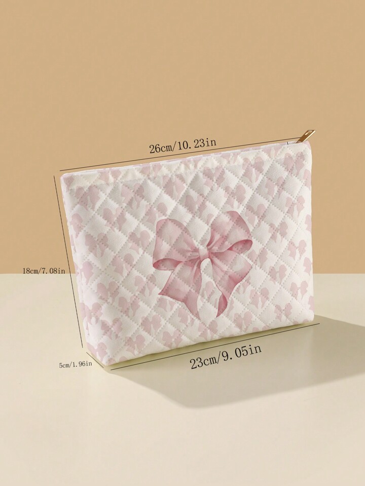 Kawaii حقيبة تجميل ماسية مطبوعة على الجوانب بنمط القوس الوردي اللطيف