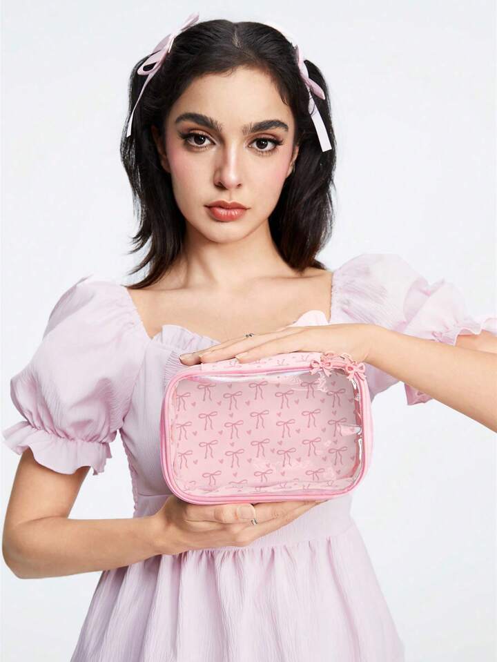 Kawaii كيس تخزين مربع شفاف لطيف باللون الوردي للمستحضرات التجميلية والحاجيات