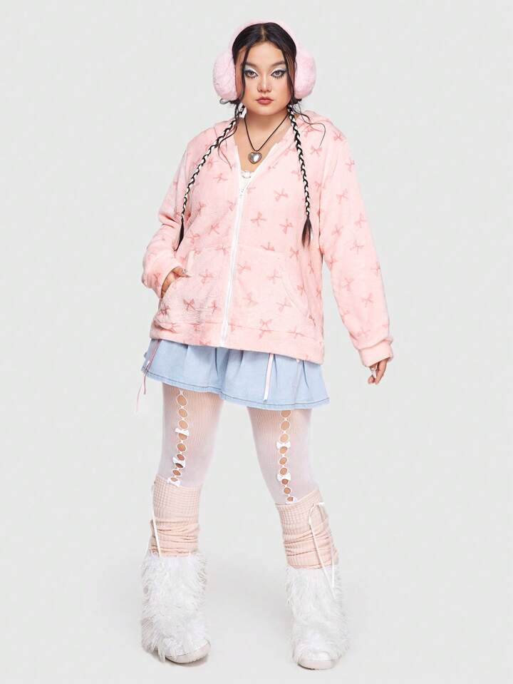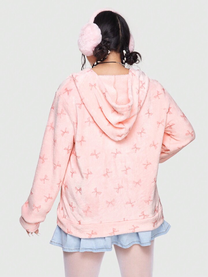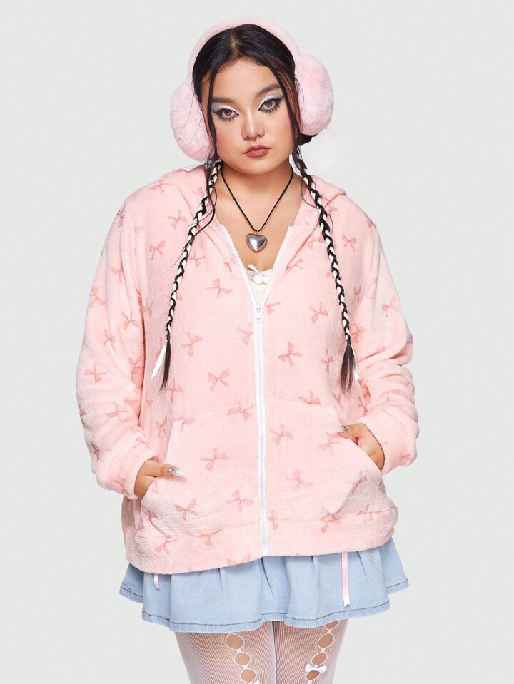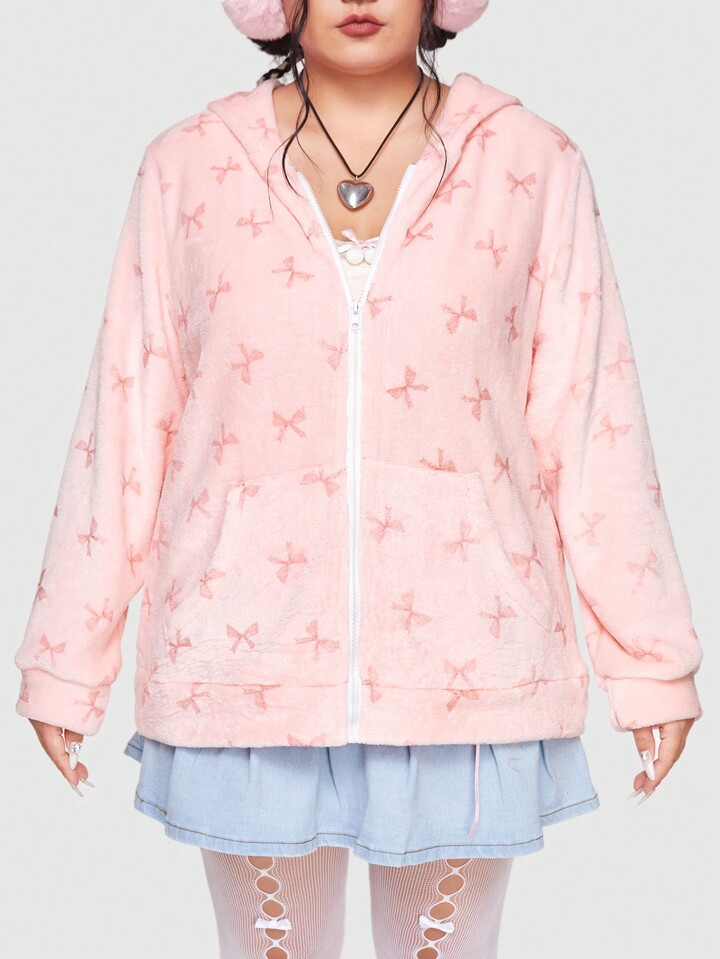 Kawaii جاكيت بطباعة عقدة الفراشة سستة قبعة مقاس كبير
