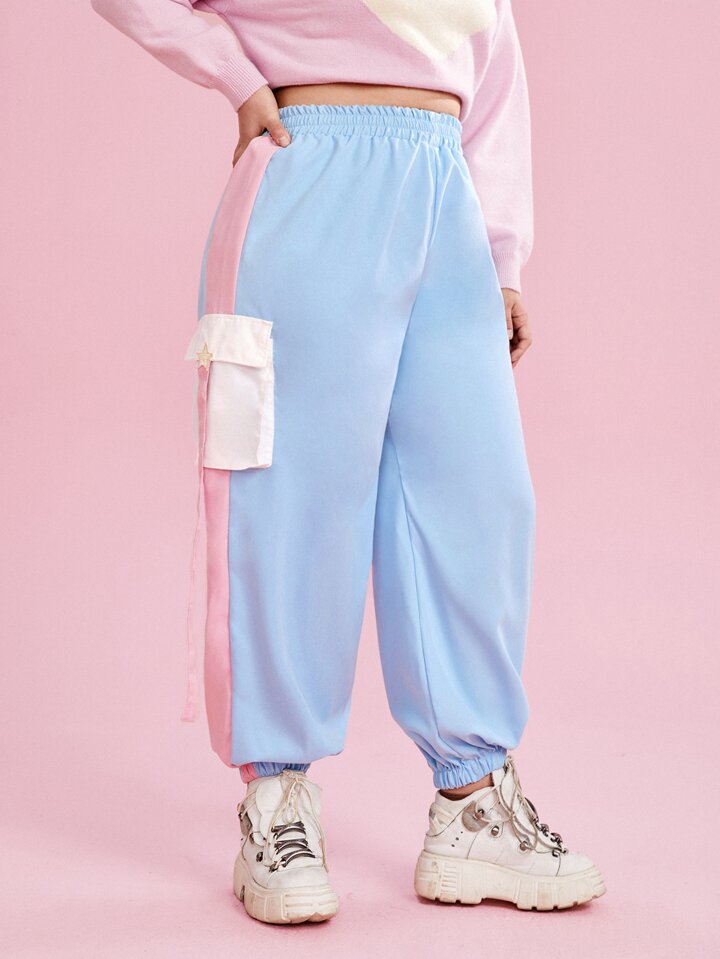 Kawaii بنطلون كارجو ألوان متباينة جيب قلاب مقاس كبير