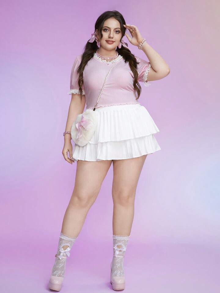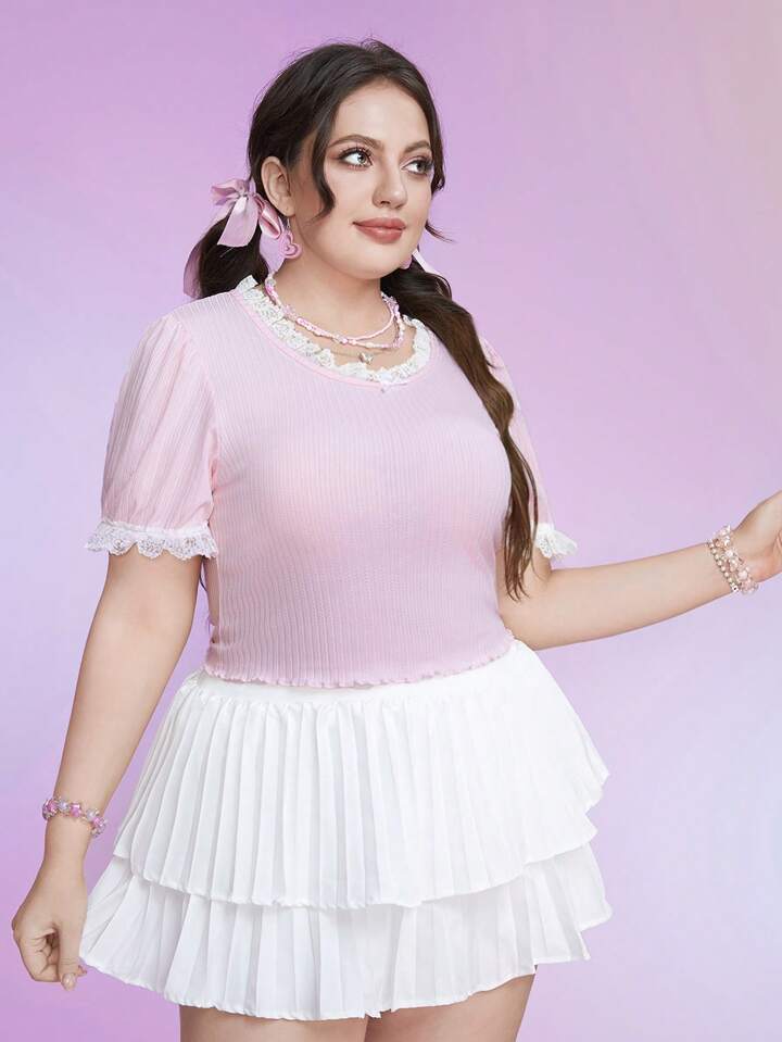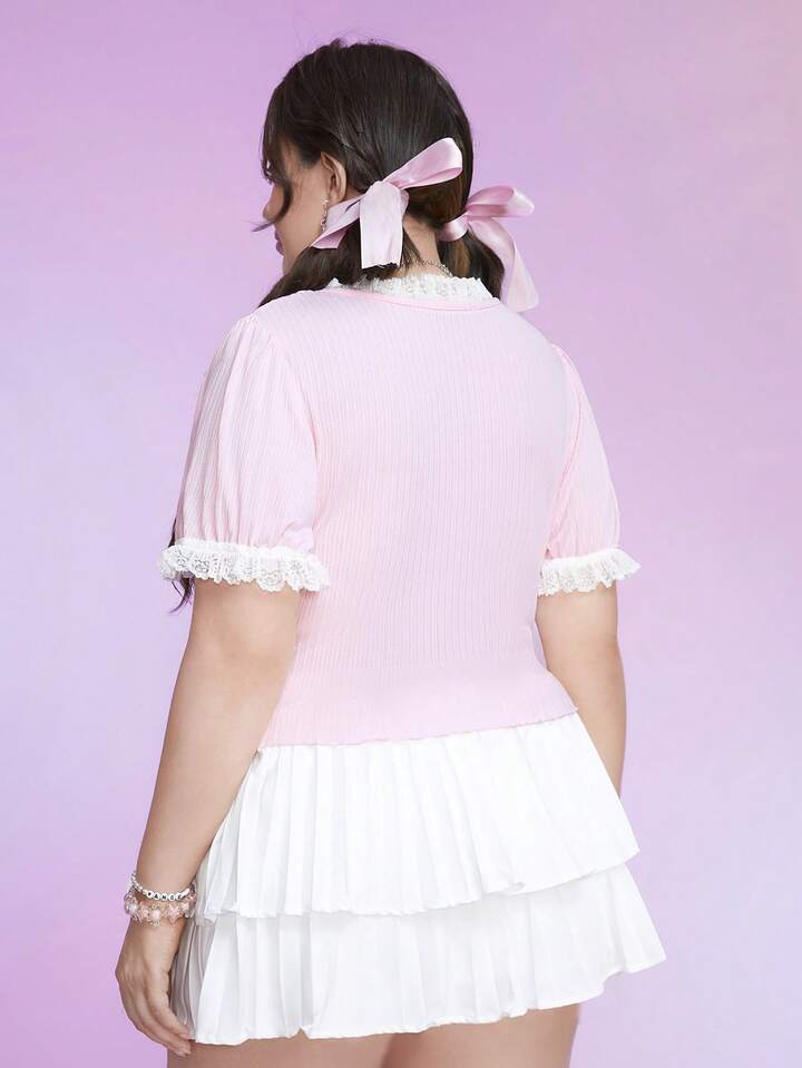 Kawaii تي شيرت دانتيل متباين اللون مقلم بهدب مقاس كبير