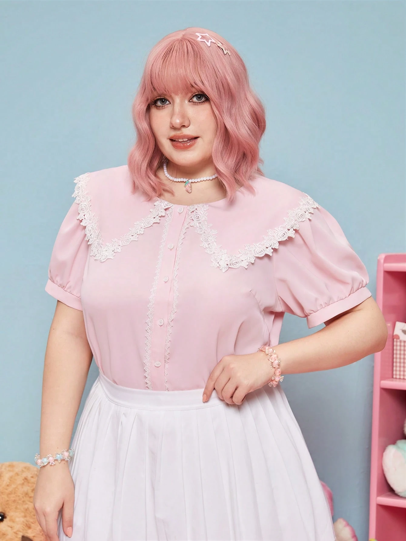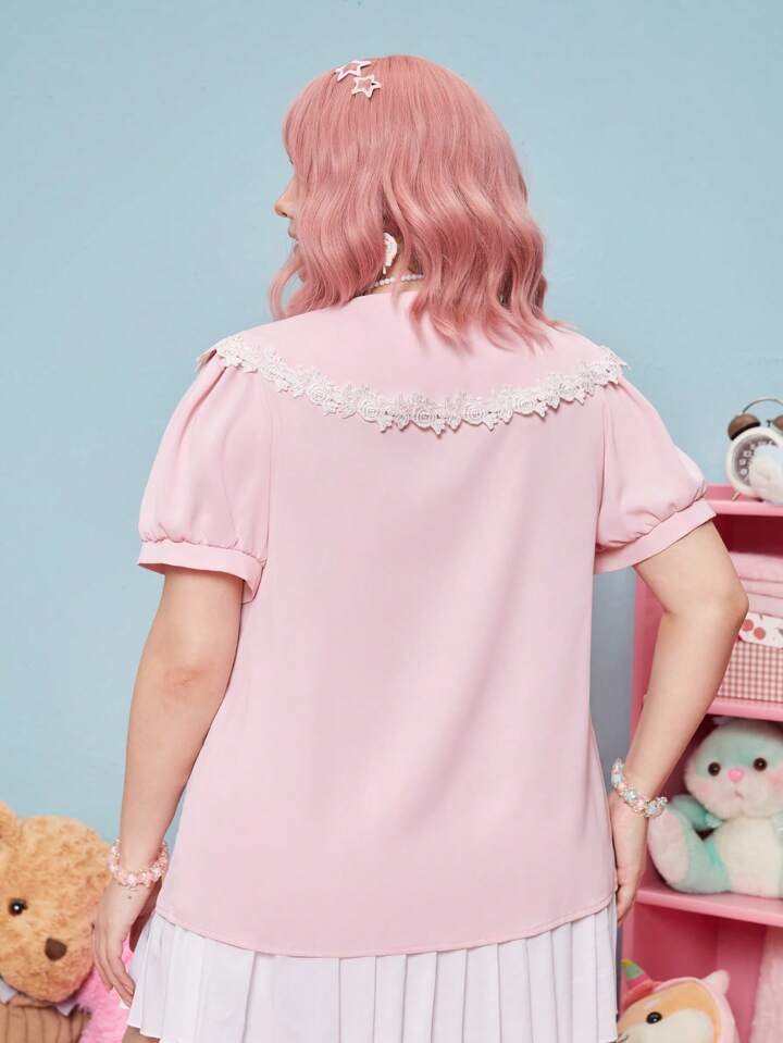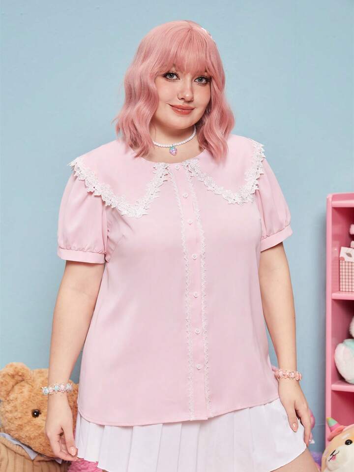 Kawaii قميص دانتيل متباين اللون ياقة كبير مبالغ فيه اكمام منتفخة مقاس كبير