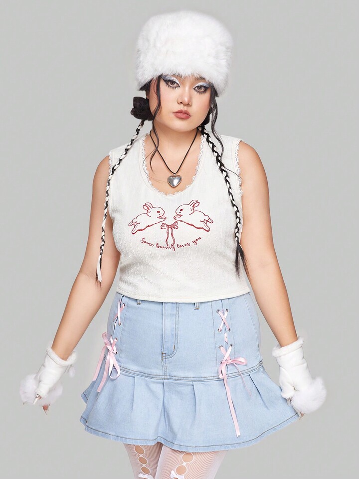 Kawaii لباس علوي تانك مطرز تصميم رسوم كارتون و نمط شعار مقلم دانتيل مقاس كبير