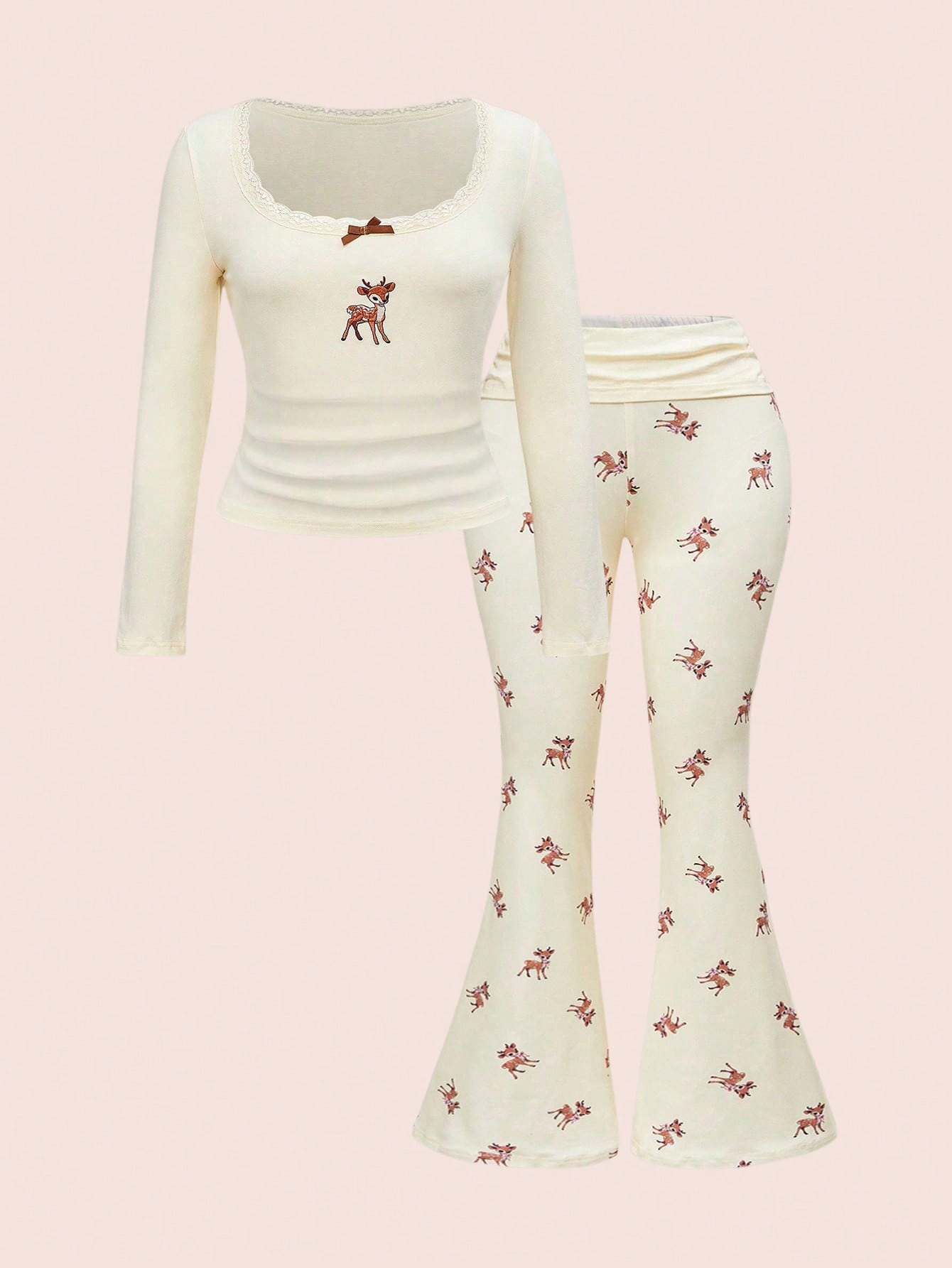 Kawaii مجموعة قطعتين من قميص بلوزة مطرز بالدانتيل على شكل غزال وبنطلون واسع مطبوع بغزال، مقاسات كبيرة، للخريف/الشتاء