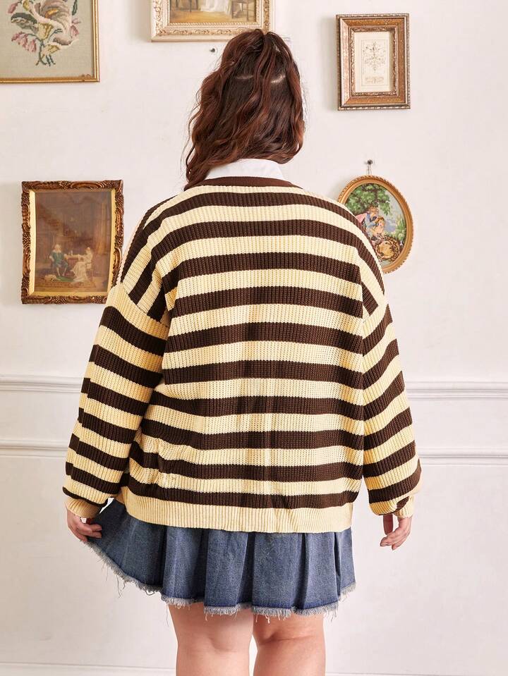 Kawaii كارديجان نمط مخطط منخفض الاكتاف جيب مرقع مقاس كبير