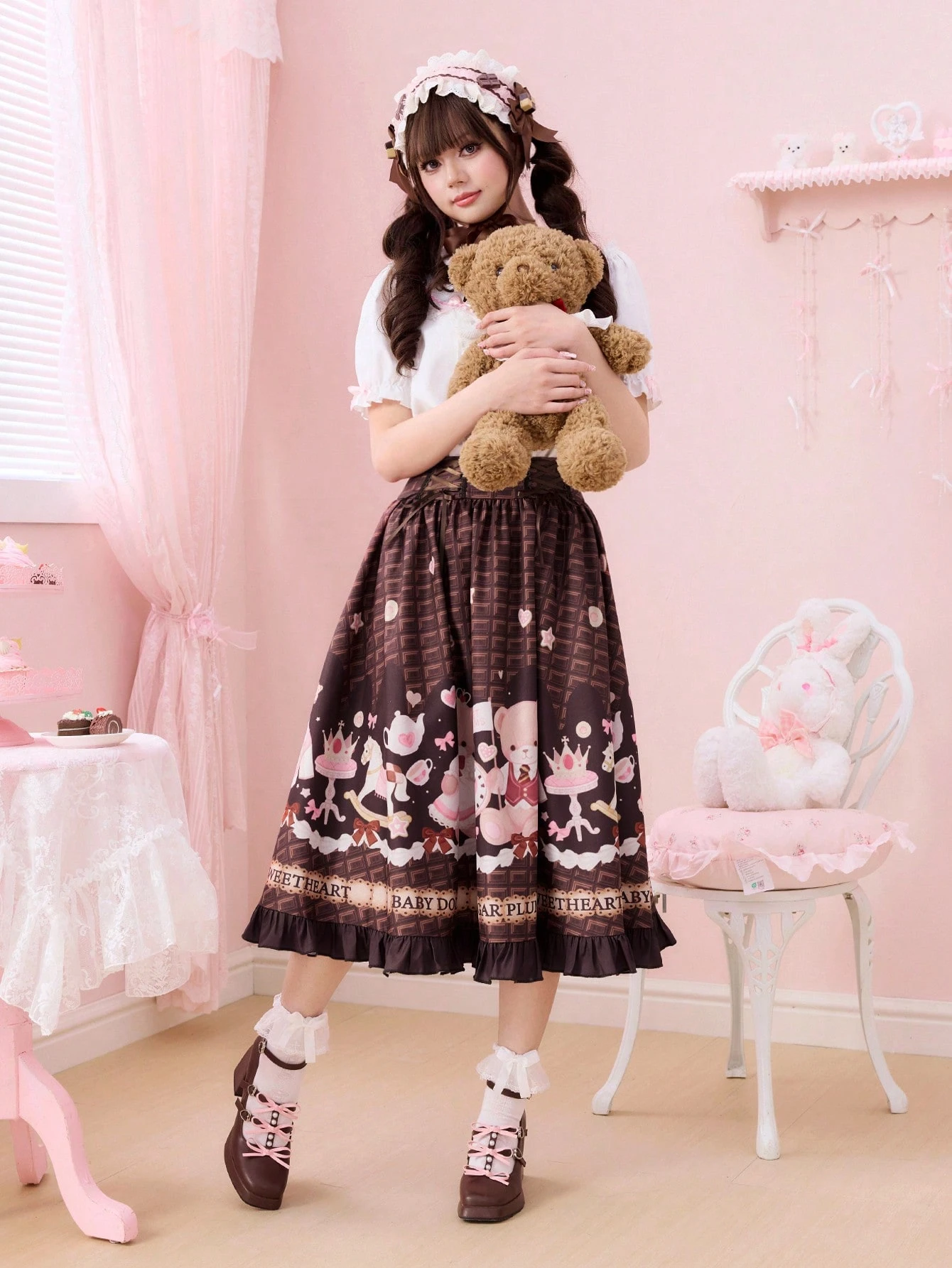 Kawaii تنورة أنيقة بخط الخصر على شكل قلب شوكولاتة، دب أطفال، فيونكة، كعكة، كعب عالي، تاج، طباعة حفلة الشاي