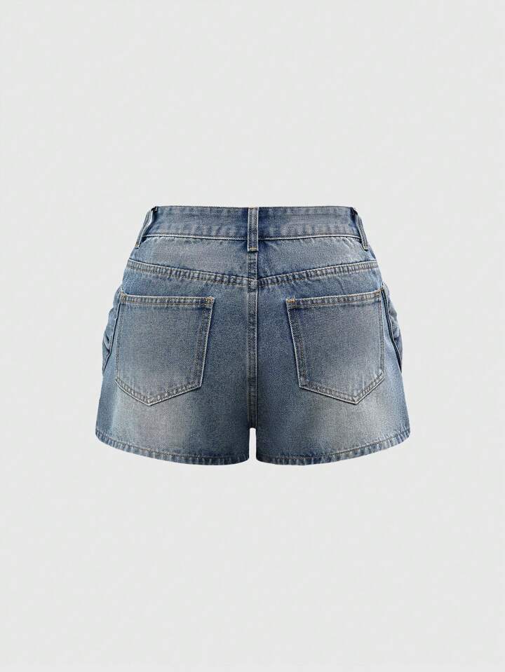 Kawaii شورت جينز نسائي ذو جيب مع عقدة مزخرف باللون الأزرق المغسول واحه البالي