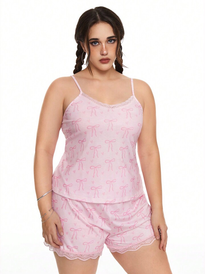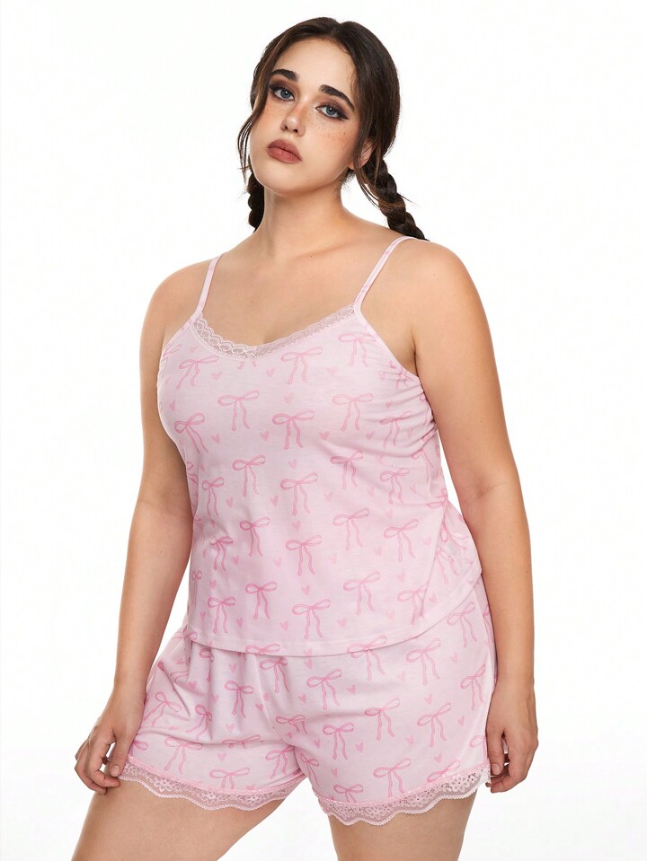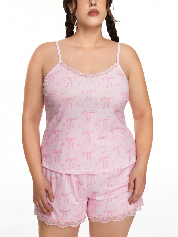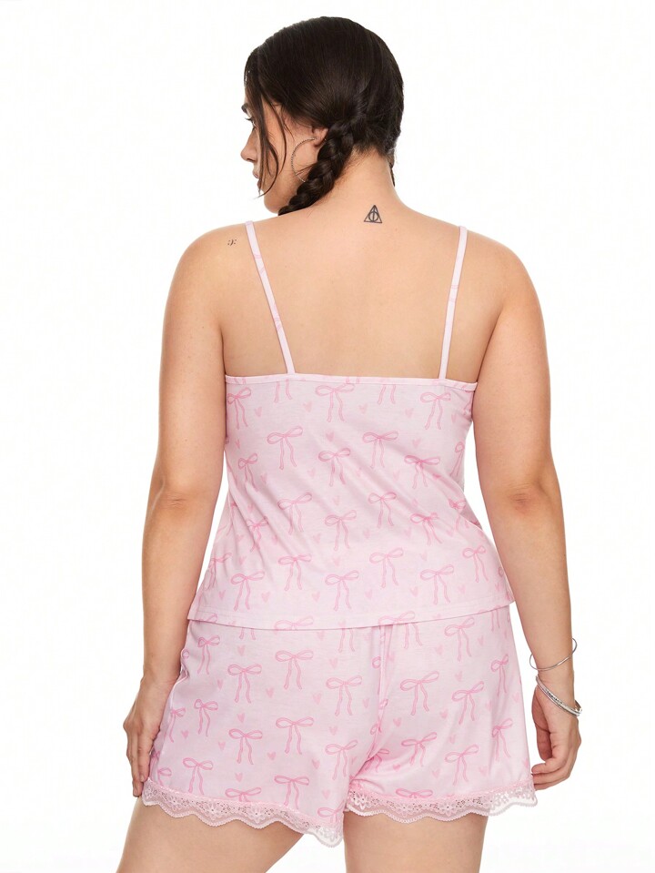 Kawaii طقم بيجاما كامي بقياس زائد مكون من قطعتين، بتصميم فراشة وزهرة القلب الرومانسي وإدماج بخطوط دانتيل