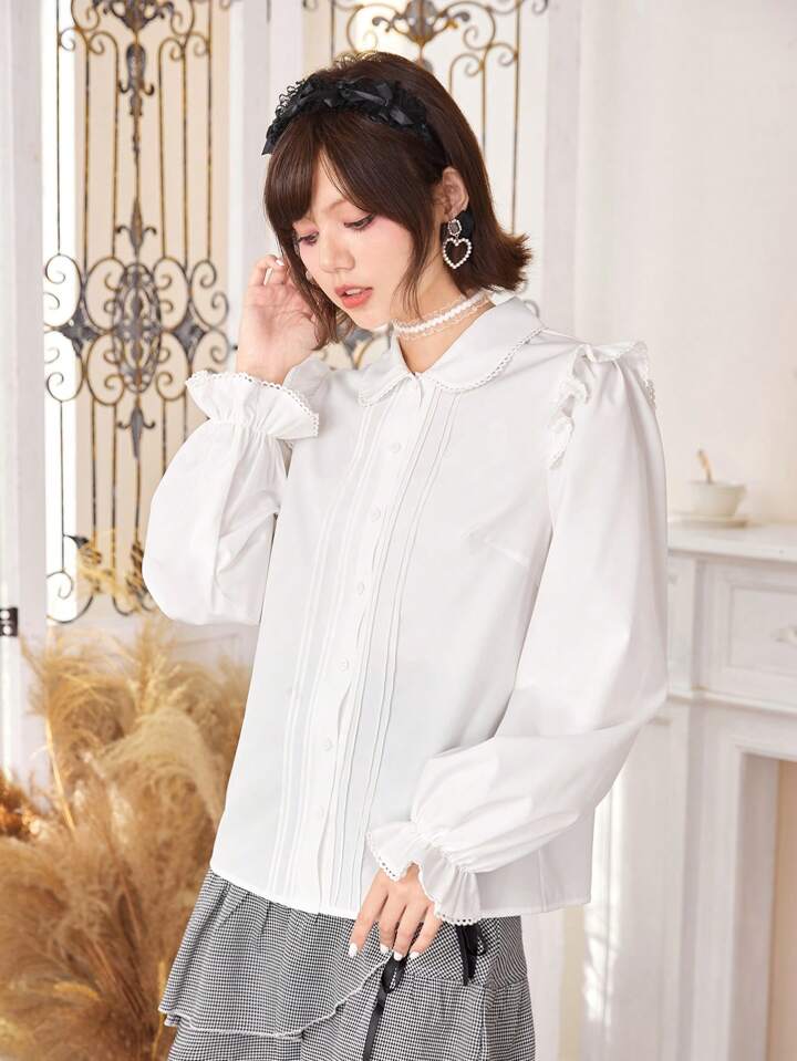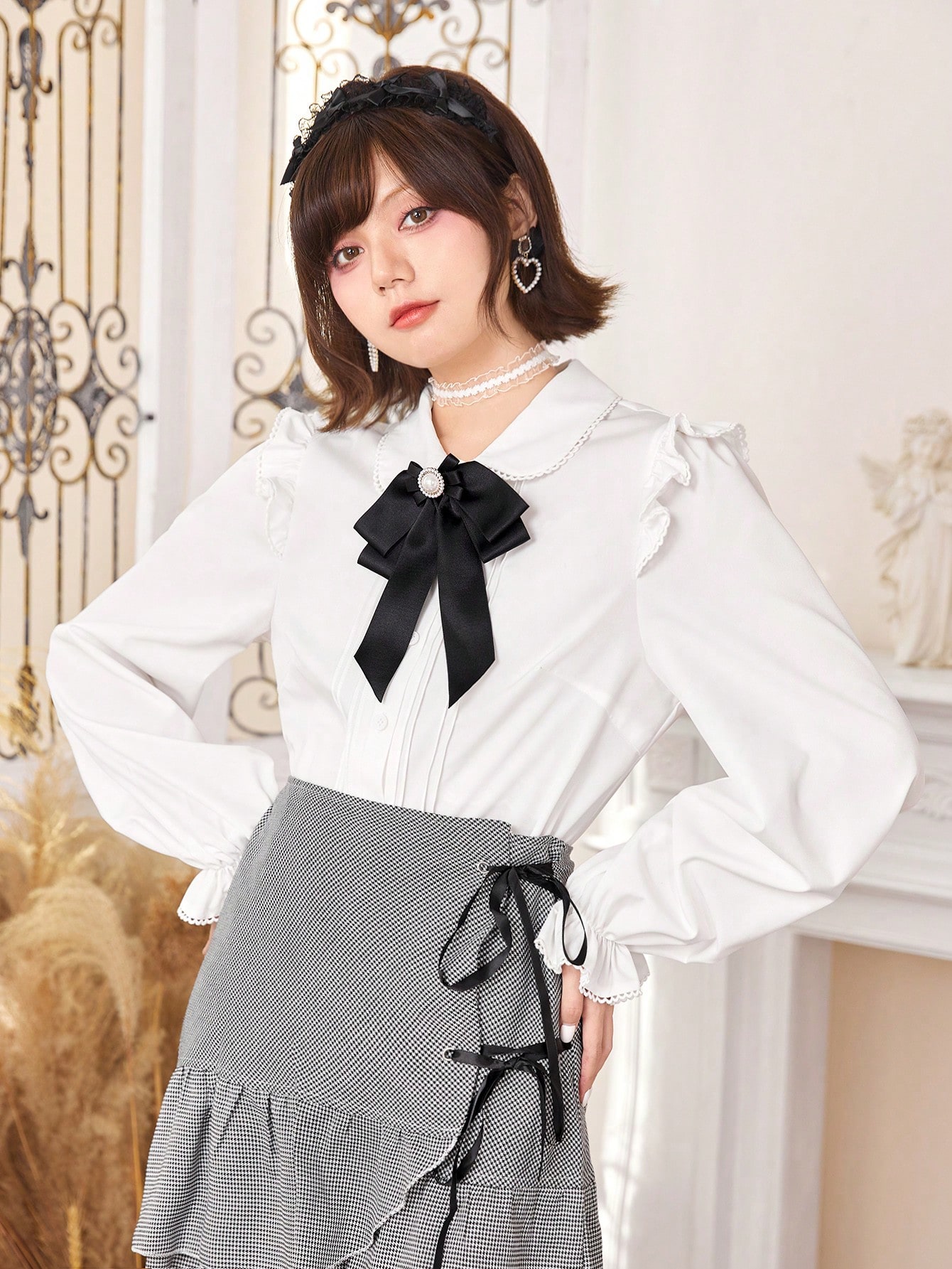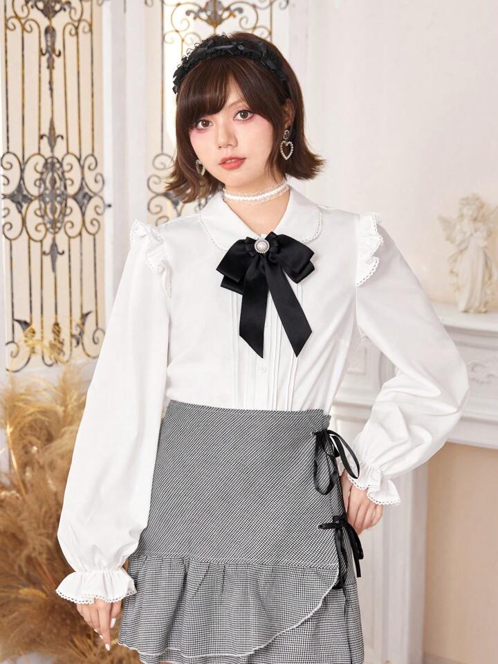Kawaii قميص مقلم بكشكش بدون عقدة الفراشة