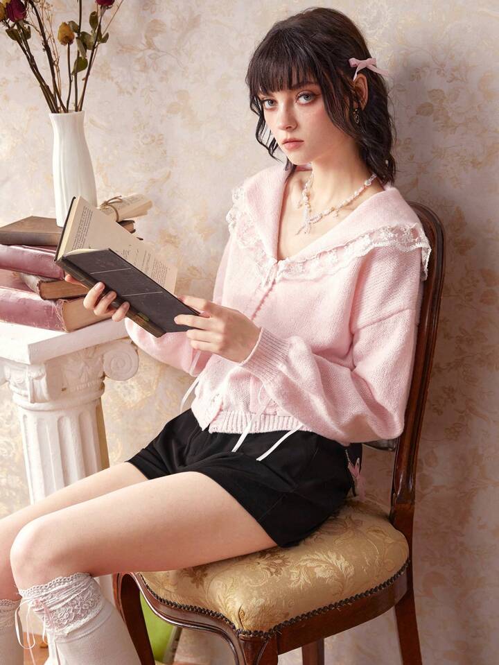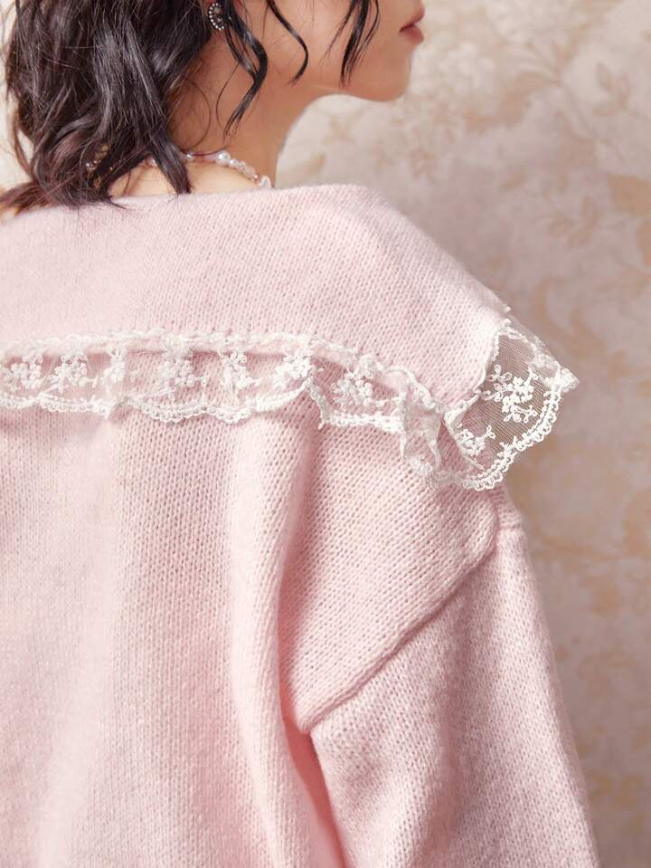 Kawaii كارديجان ياقة البحار بتفاصيل دانتيل منخفض الاكتاف