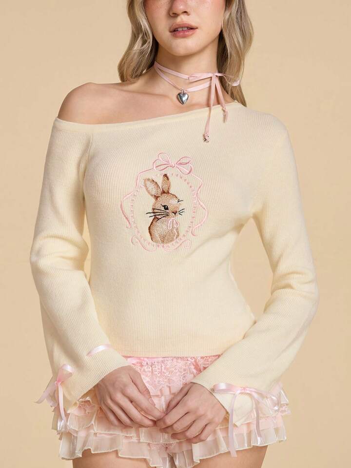 Kawaii كنزة صوفية بكنزة متدلية من الكتف مزينة بفيونكة وأرنب مطرز