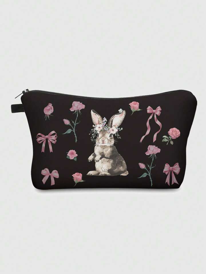Kawaii الموديل رقم 987005 حقيبة مستحضرات التجميل المحمولة مع سحاب، نمط قلب القوس والأرنب من البوليستر، حقيبة مستحضرات تجميل للسيدات، حقيبة أدوات تجميل للسفر، هدية عيد الحب