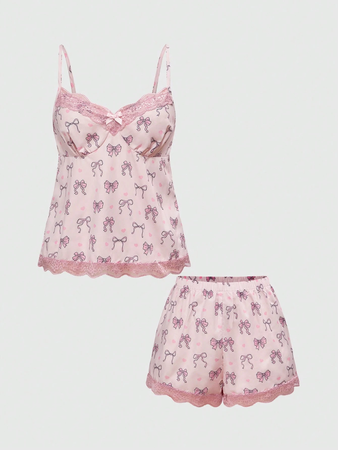 Kawaii طقم بيجامة صيفي لبس المنزل ناعم رفيع من الدانتيل مع تفاصيل الفراشة